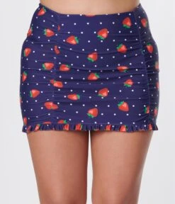 Unique Vintage Navy Strawberry Pin Dot Ruffled Swim Skirt