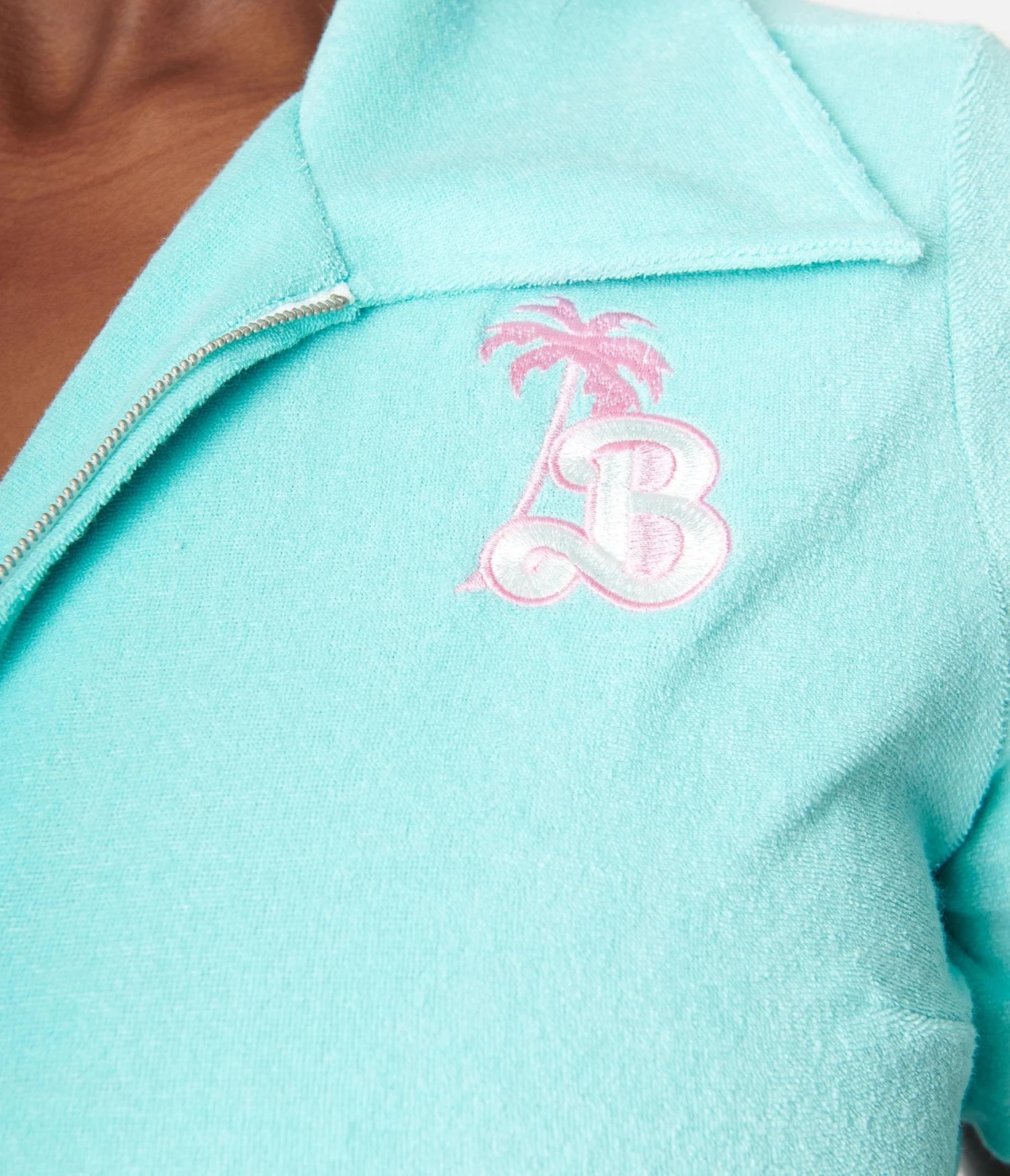 This vivacious plus size silhouette, in collaboration with Barbie, is crafted in a brilliant light blue cotton terry cloth that features embroidered florals on the shorts and a sweet cursive B on the chest. The front zipper leads to the classic collar, while the darted bodice, seamed waist, and short sleeves all lend casual design.