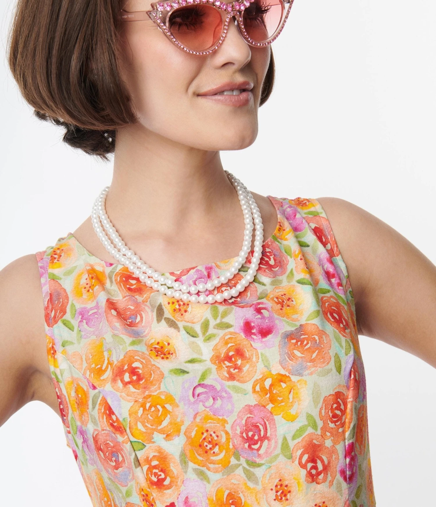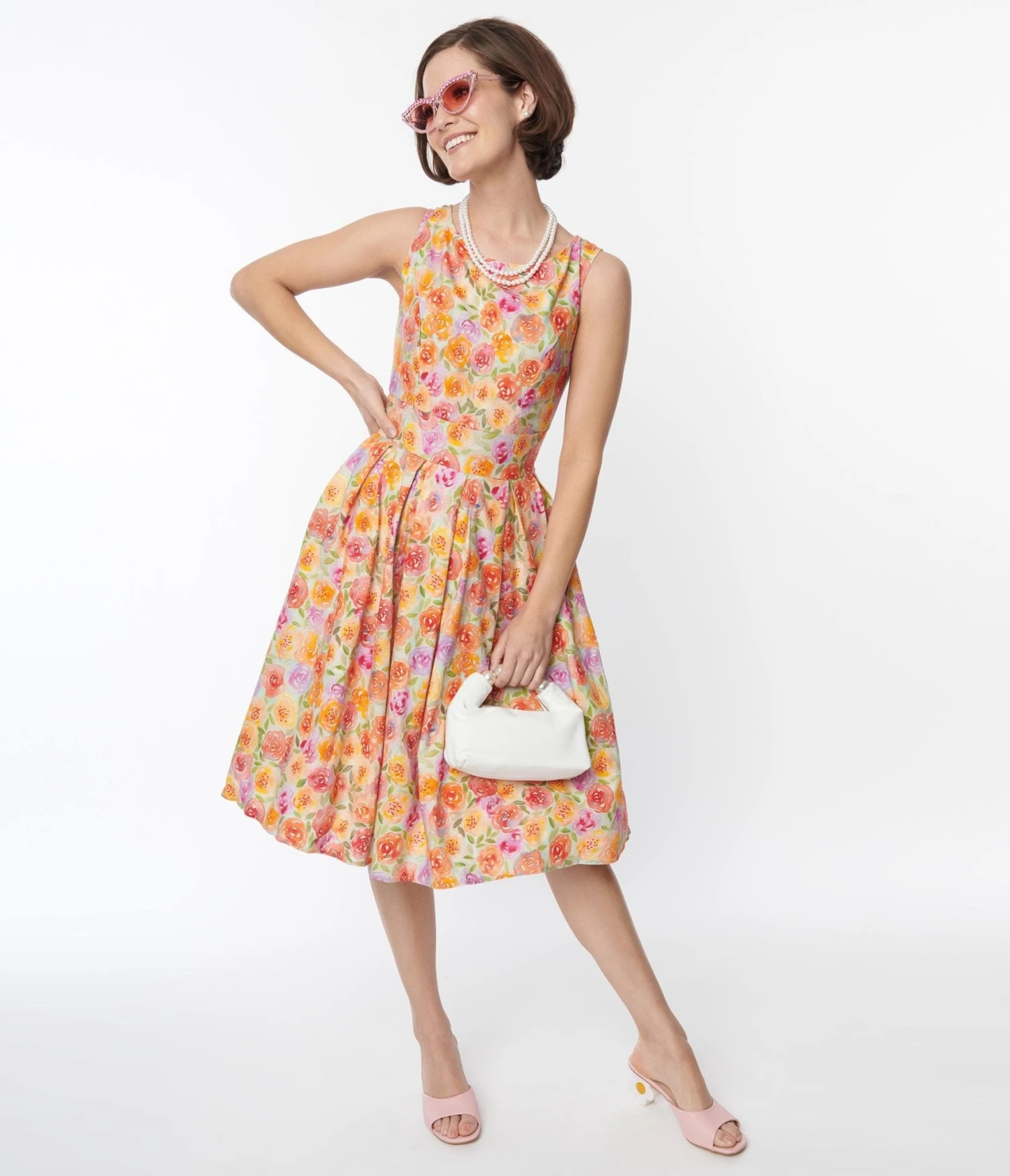 This beautiful 1950’s style fit and flare dress is crafted in a beige woven fabric and features orange and purple floral print throughout. The sleeveless silhouette features a scoop neckline and the back has a concealed zipper for easy wear. Complete with side pockets.