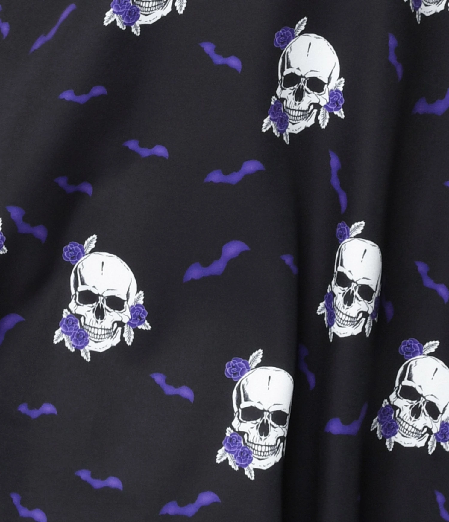 This enchanting piece will have heads turning as you flaunt its captivating allure. Its black satin ribbon belt cinches at the waist, accentuating your curves while adding an elegant touch. The allover print of purple bats and skulls on the skirt exudes a mystical charm, perfect for embracing your mysterious side. With a flattering scoop neckline and long sleeves, this dress promises both comfort and style.