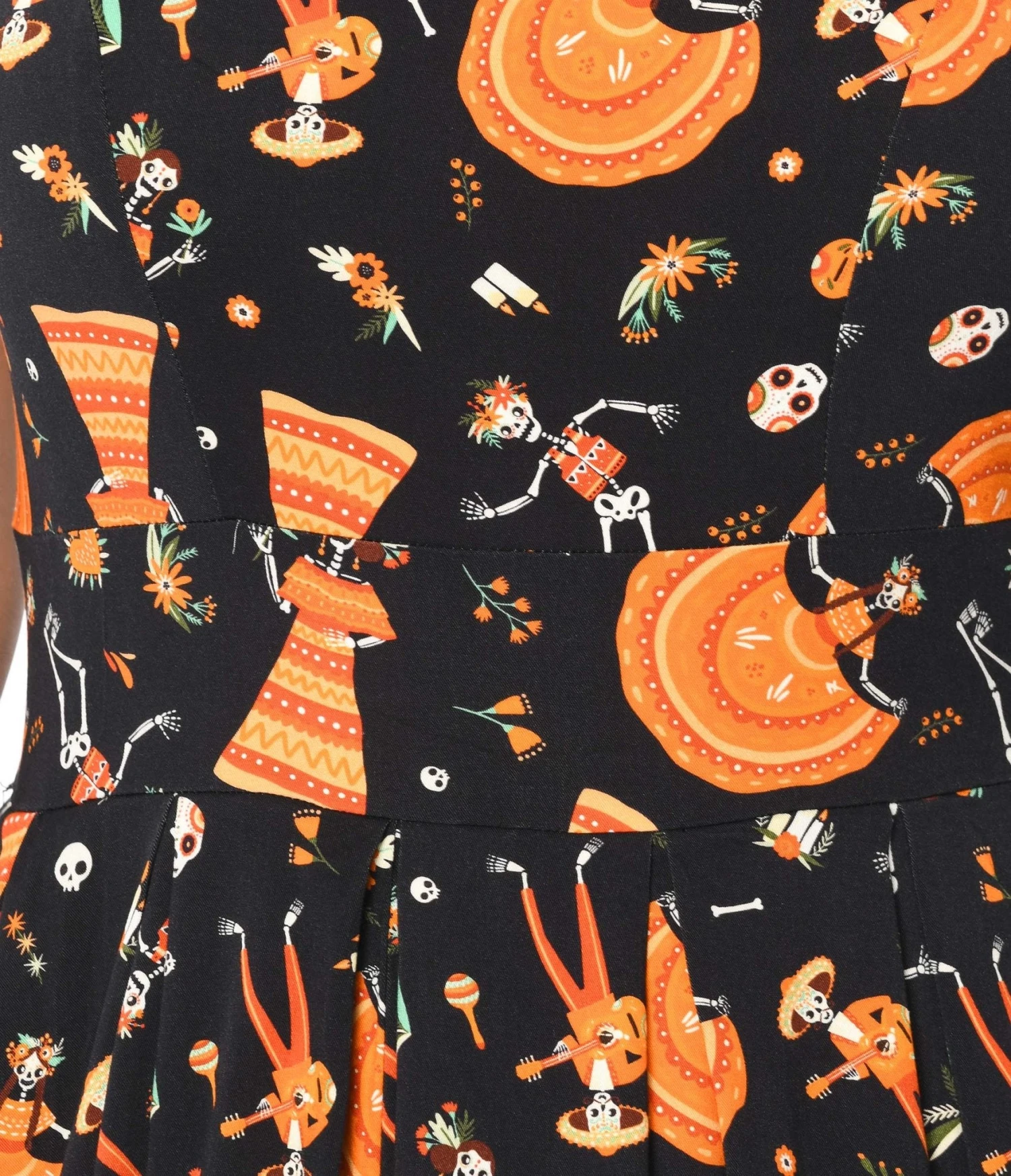This sweet 1950’s style swing dress is crafted in a black woven fabric and dances with a charming orange Day of the Dead inspired print throughout. The sleeveless silhouette features a back zipper and side pockets.