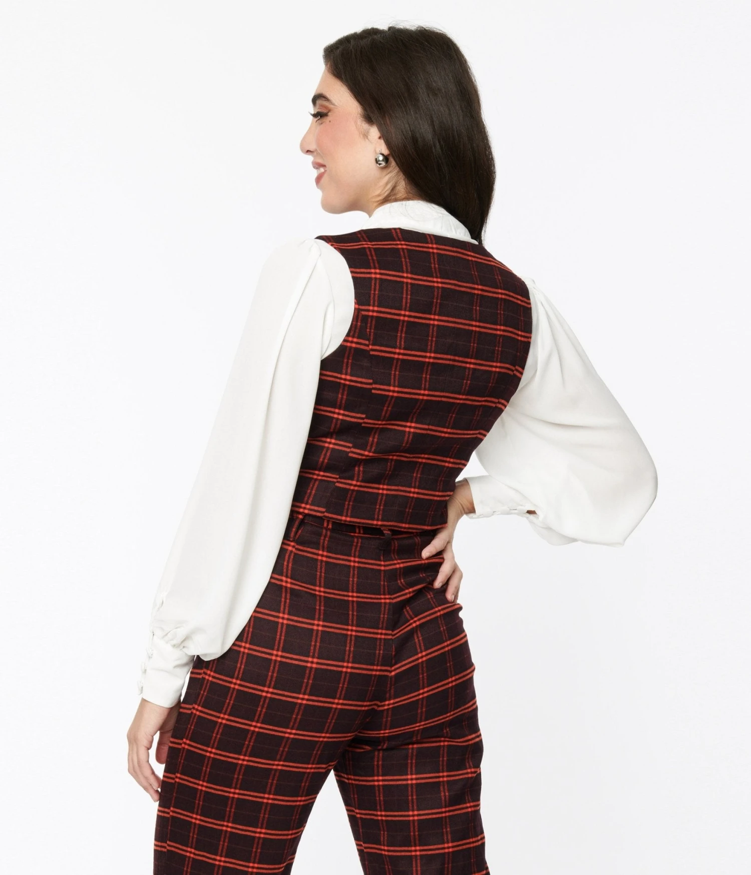 This trendy and versatile 1950s style vest features a striking black and orange windowpane pattern that adds a pop of color to any outfit. The single button front and v-neckline create a flattering silhouette, while the faux front pockets offer a charming touch. Whether you’re dressing up for a special occasion or looking to add some personality to your everyday look, this vest is sure to make a statement.