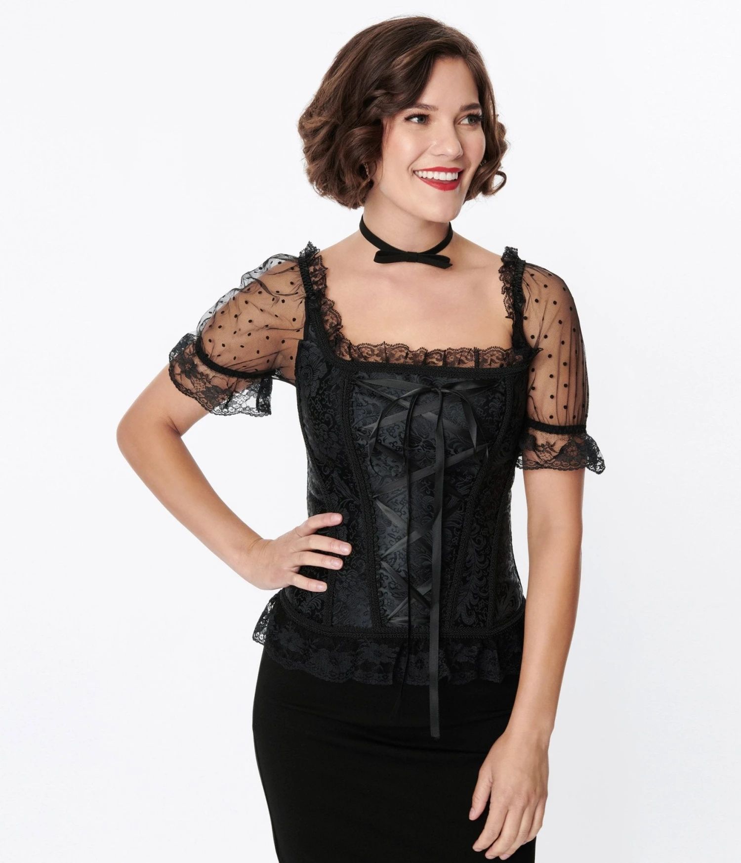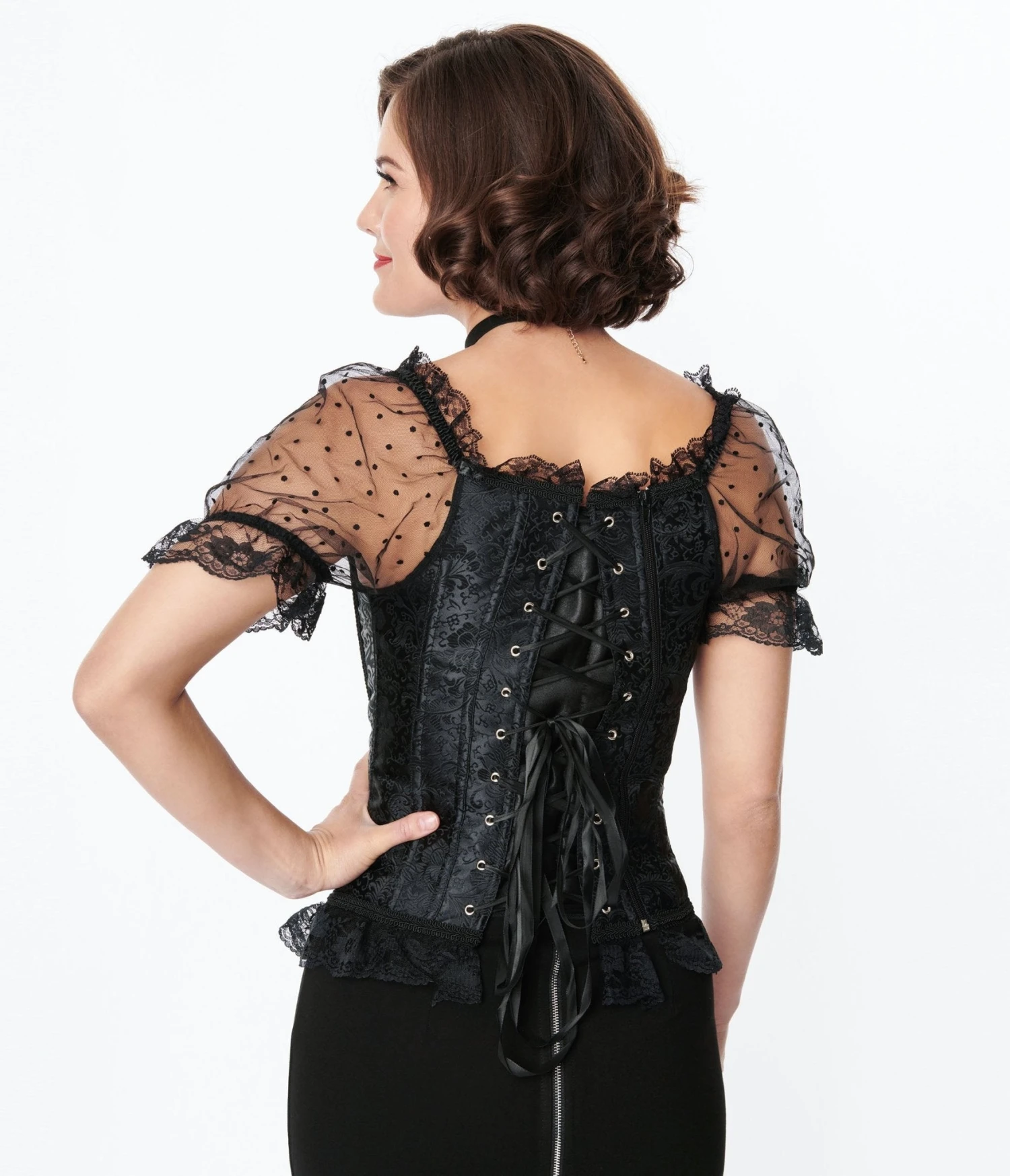 This gorgeous corset style top is crafted in a black paisley embossed woven fabric, framed by sheer puff sleeves. Complete with front and back corset lacing, back zipper, and corset boning.