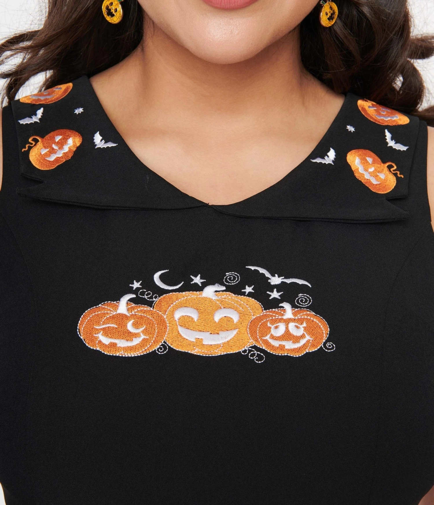 This frighteningly cute flare dress is rafted in a black woven fabric accented with embroidered jack-o-lanterns on the bodice and collar. Complete with back zipper and side pockets!