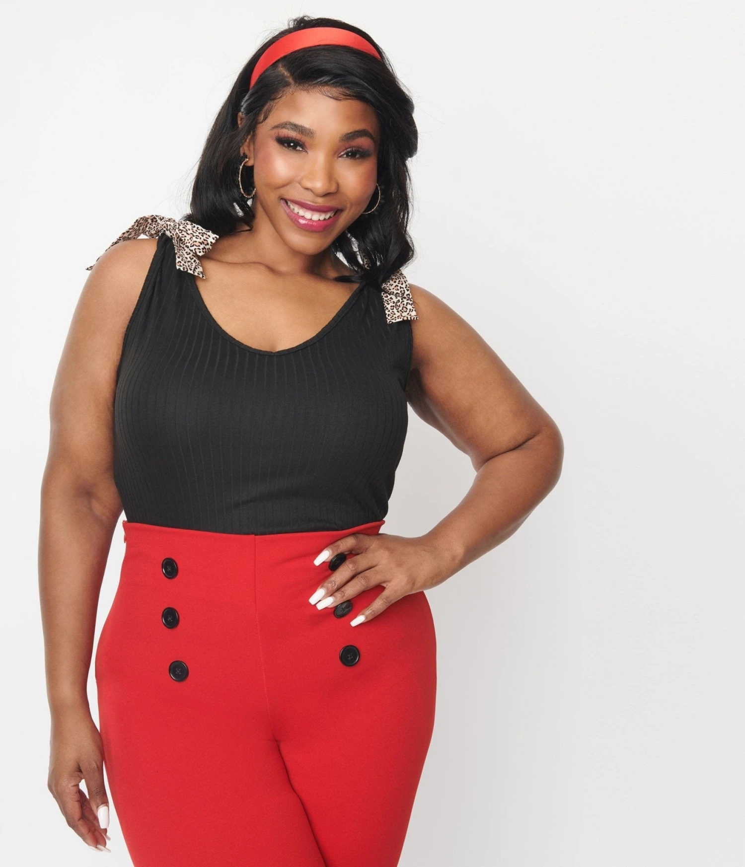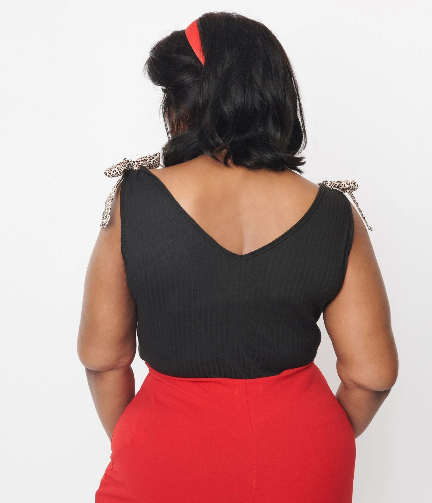 This lovely top is set in a black ribbed knit and boasts adorable leopard bows tied at the straps.