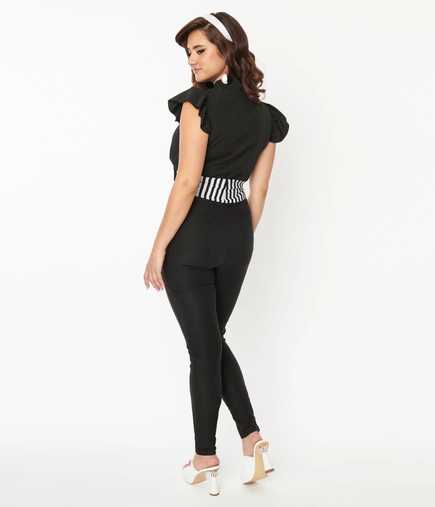These sleek and stylish skinny pants are designed with black stretch woven fabric that offers maximum comfort, never compromising on style. The eye-catching feature of these pants is undoubtedly the chic black and white striped contrast waist which adds a touch of elegance to your ensemble. With convenient side and back pockets, you can easily carry your essentials while keeping your hands free.