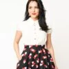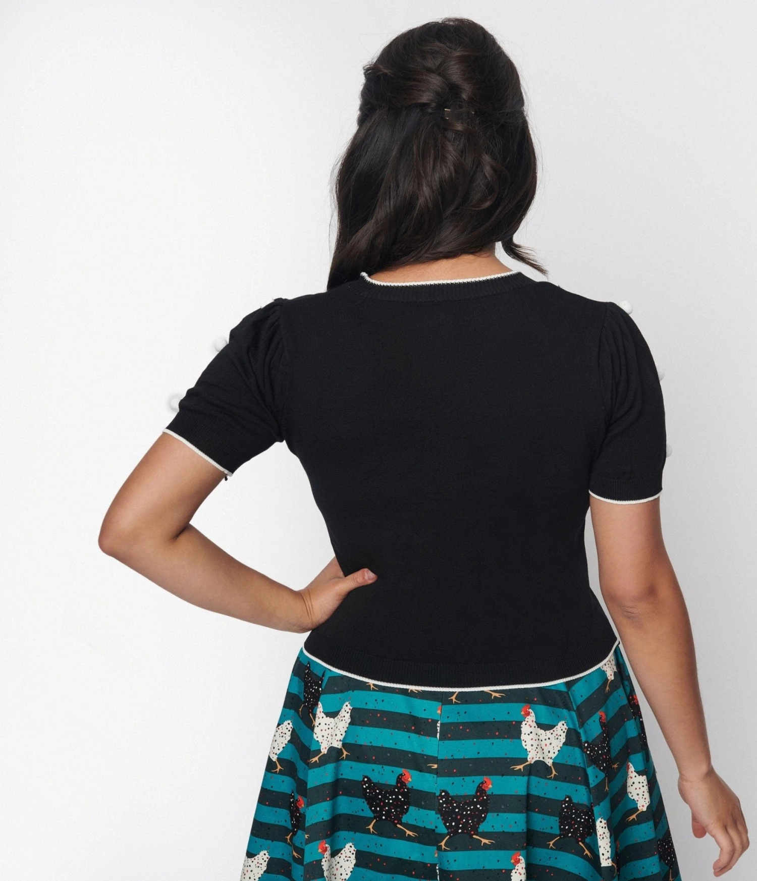 This snazzy 1950s style cardigan is set in a black knit with white piping and dances with fun 3D white polka dots throughout. Outfitted with a button down closure and short sleeves.