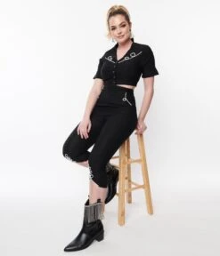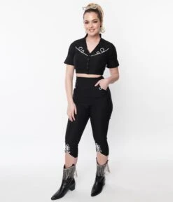1950’s inspired capri pants crafted in a black stretch bengaline and features white trim on the pockets and hem. Complete with side pockets and back zipper.
