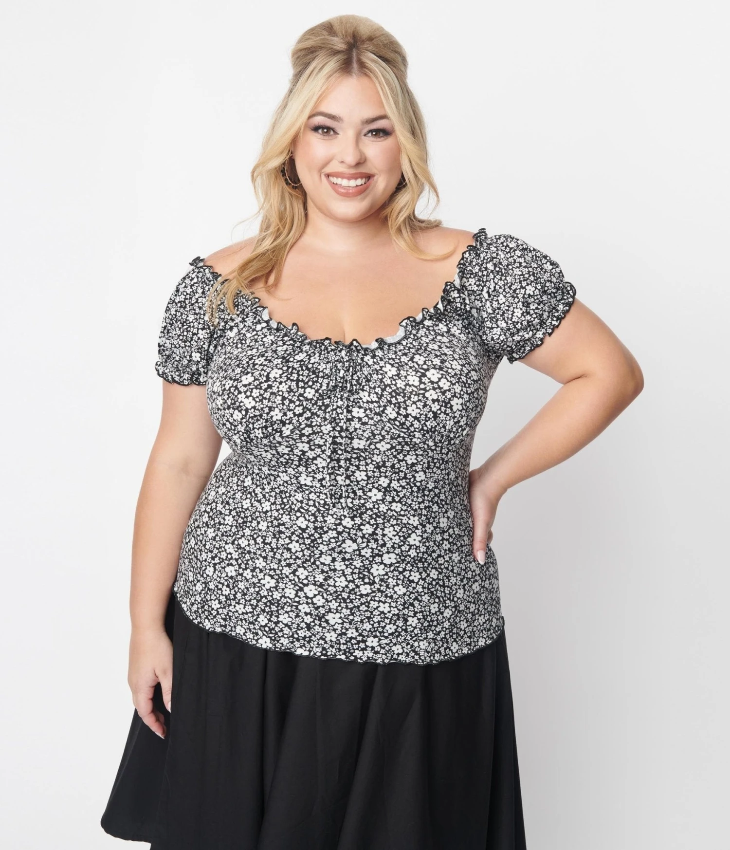 This charming top is crafted in a black knit and dances with white ditsy florals throughout. Outfitted with a ruffle trim off the shoulder neckline and short elastic cuff ruffle trim sleeves.