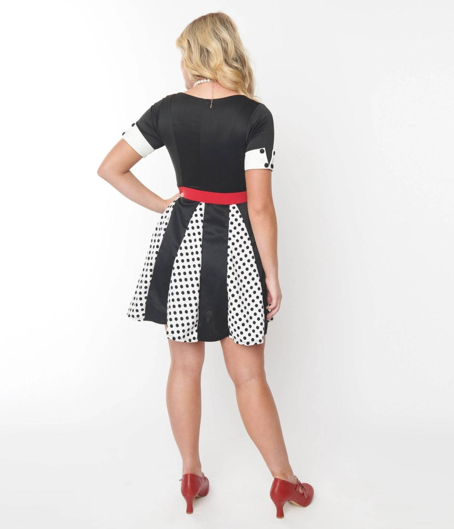 Make a bold fashion statement with this gorgeous 1950s style black knit dress, featuring a striking white contrast pleated godet skirt adorned with playful black polka dots. With its short contrast cuffed sleeves and chic V-neckline, this dress is designed to enhance your natural curves and draw attention to your best features. The dress also includes a red belt to elegantly cinch the waist and complement the overall look. With a convenient side zipper, this dress is easy to wear and perfect for any event where you want to turn heads.