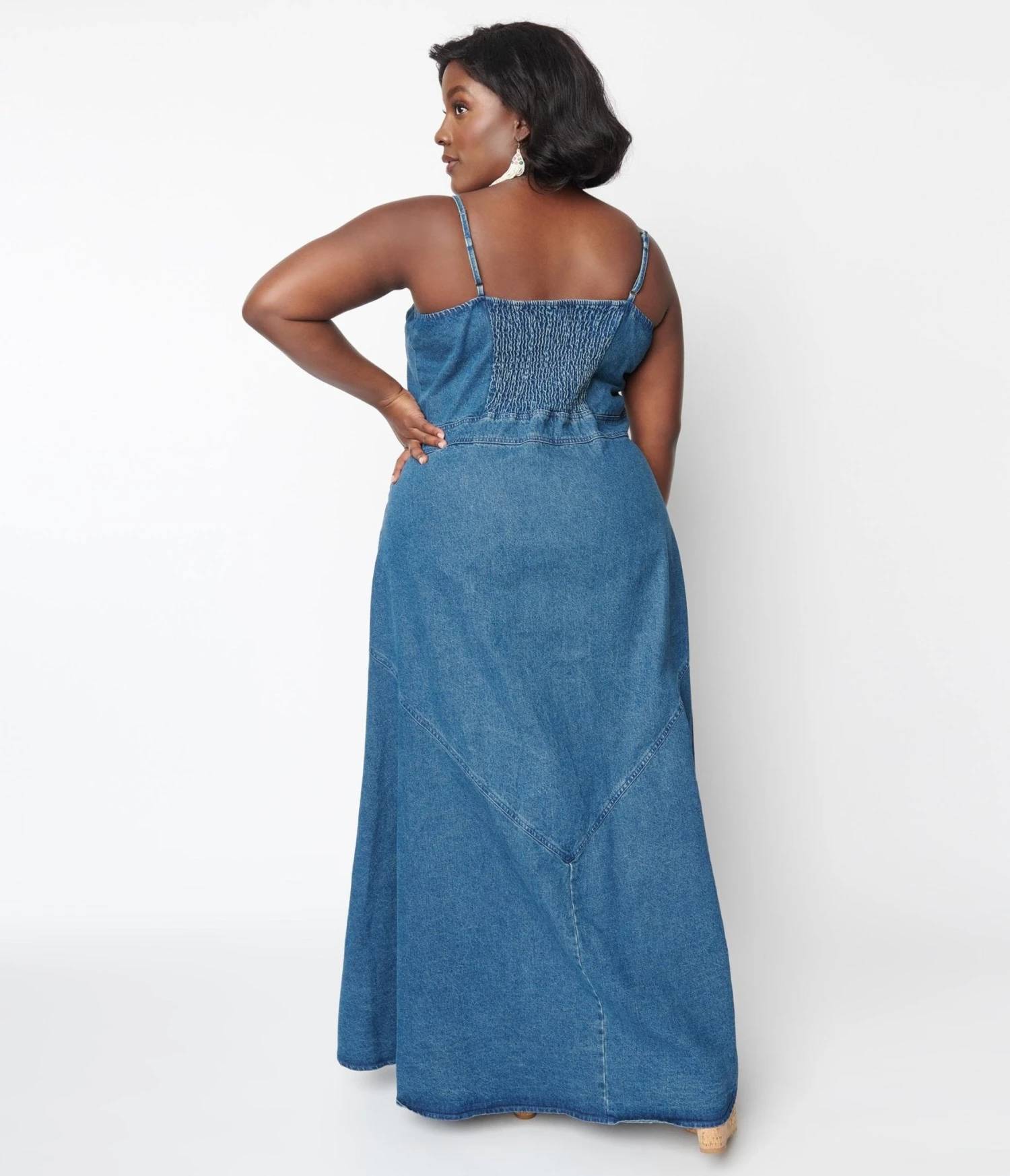 This sweet maxi dress is crafted in a blue denim and features a scoop neckline with adjustable spaghetti straps. Complete with a button down front and smocked back.
