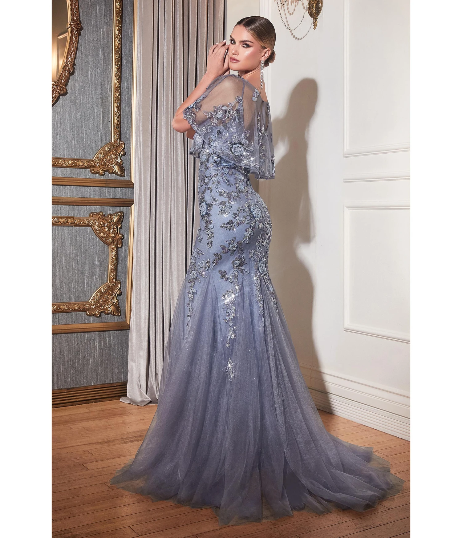 Cinderella Divine Smoky Blue & Silver Rhinestone Floral Trumpet Bridesmaid Gown