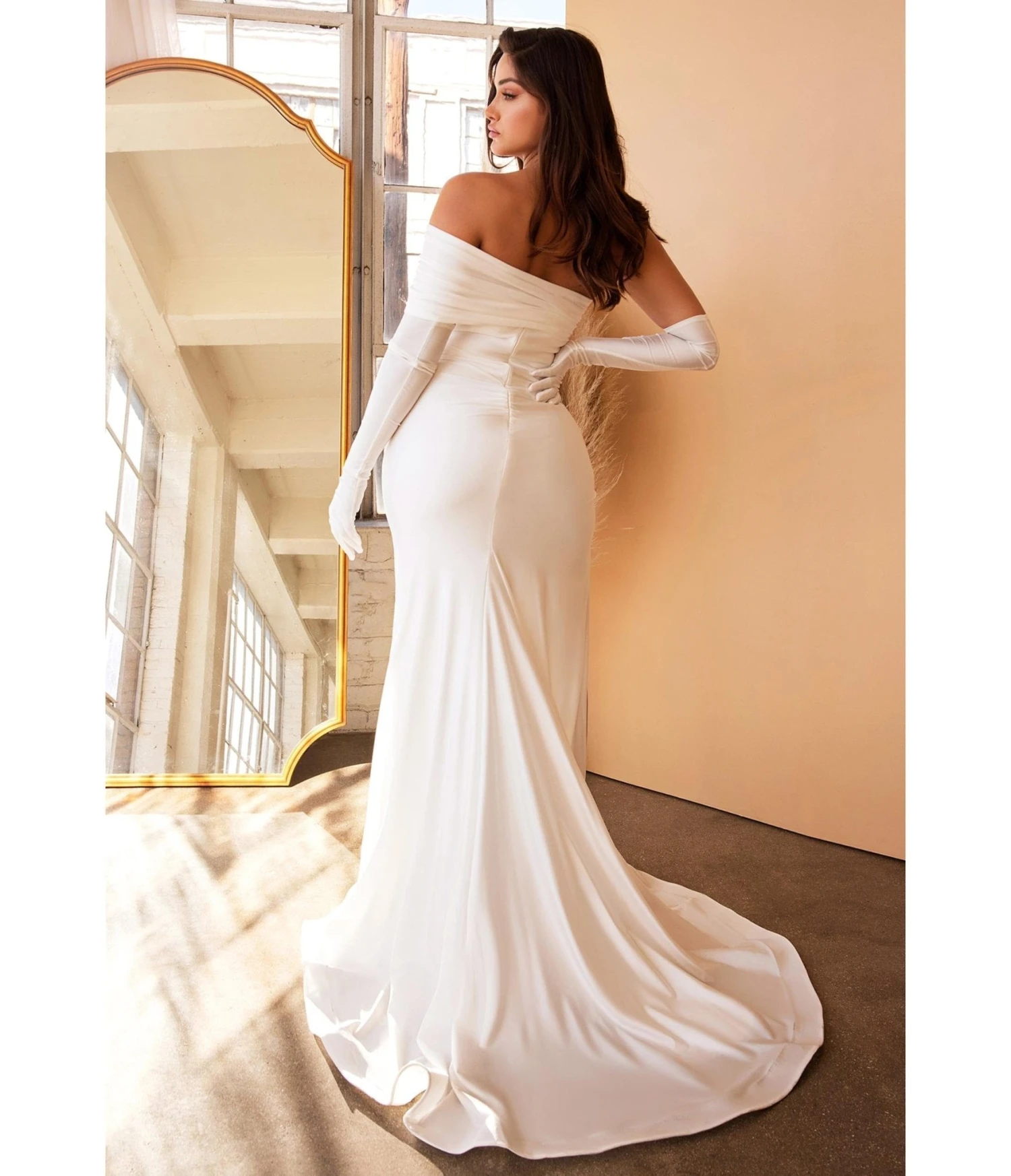 This exquisite style has a fitted bodice with ruching, a hidden sweetheart neckline, and asymmetric sleeves that can be worn on or off-the shoulder. The skirt parades into a full-length trumpet silhouette while flaunting a side slit and a sweeping train. Complete with included opera length gloves.