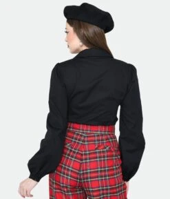Made from a stretch woven fabric, this 1950s style blouse is designed to keep you comfortable all day long. Set in a classic black woven cotton that adds a timeless touch to your wardrobe, while the button cuffed long sleeves and attached shoulder pads offer an effortlessly chic look. With its notched lapel collar and front button-up design, this blouse can easily be dressed up or down for any occasion.