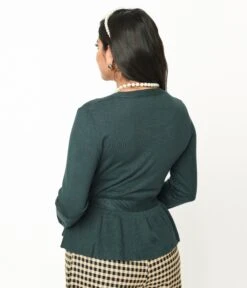 Get cozy and stylish with this 1950s style forest green knit cardigan! The peplum hem adds a touch of femininity, while the long sleeves keep you warm on those crisp evenings. With a button-up front and V-neckline, this cardigan offers versatility and comfort. Plus, it comes with a removable self-tie sash for added style options!