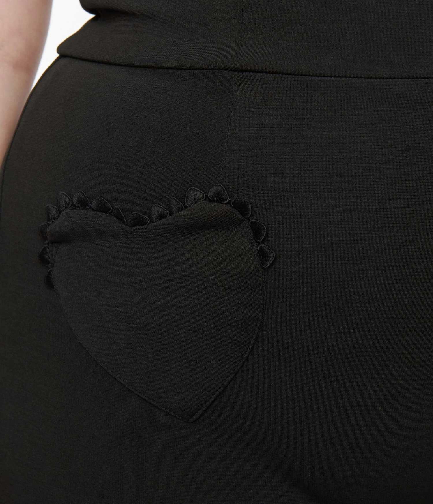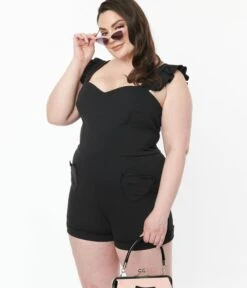 A lovable plus size romper crafted in a black stretch knit that features button adjustable straps with ruffle accents. Outfitted with a back zipper and front patch pockets in the shape of hearts.