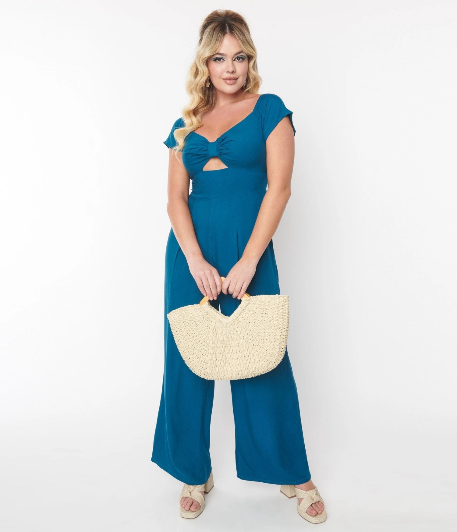 Upgrade your wardrobe with this stunning teal jumpsuit from Collectif, featuring short sleeves and a flattering V-neckline. The elastic shoulders provide a comfortable fit, while the back zipper makes it easy to slip into. The cutout midriff adds a touch of sexiness to the overall design, making it perfect for a night out.