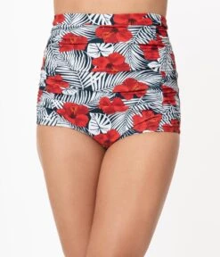 Unique Vintage Tropical Print & Red Hibiscus Monroe High Waist Swim Bottom