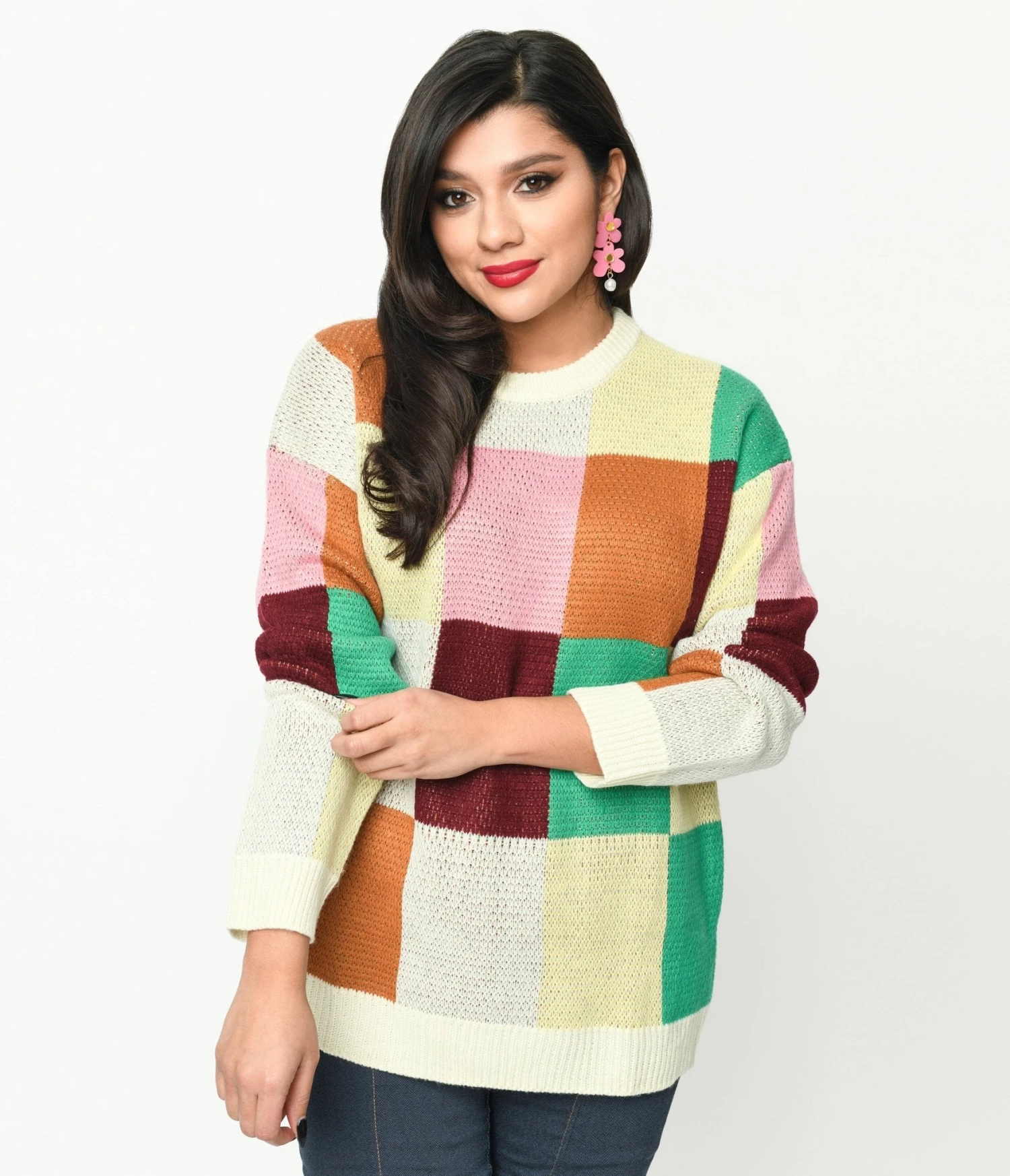 This knit pullover sweater is perfect for chilly days or a casual hangout. The cream and multicolor color block design adds a trendy touch to your outfit, making you the center of attention wherever you go. With its crewneck and long sleeves, this sweater offers not only fashion but also comfort all day long.