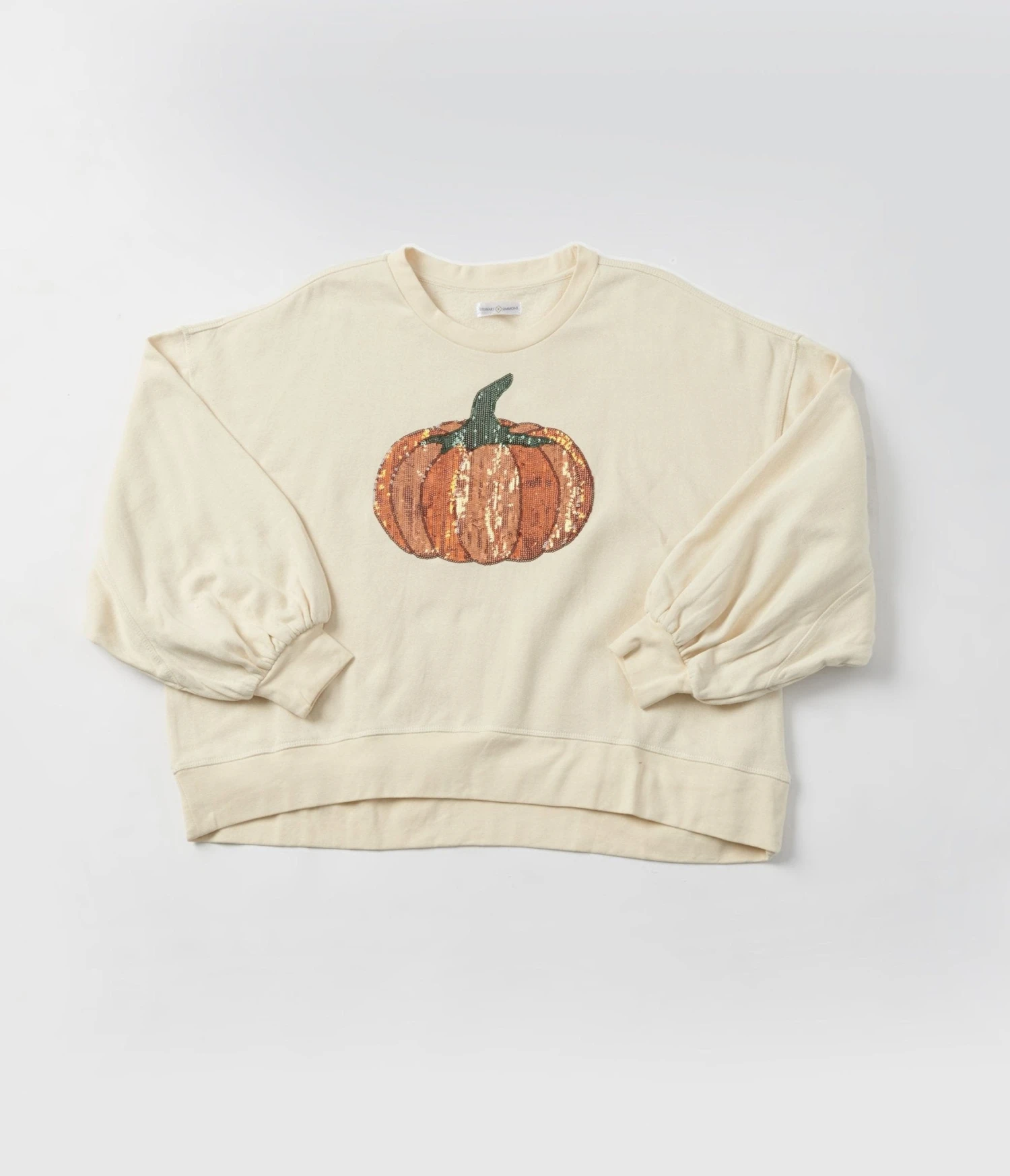 Made from soft cotton, this cream-colored sweater will keep you warm and stylish all autumn long. Its crew neckline and long sleeves add a classic touch, while the orange sequin pumpkin center adds a playful twist.