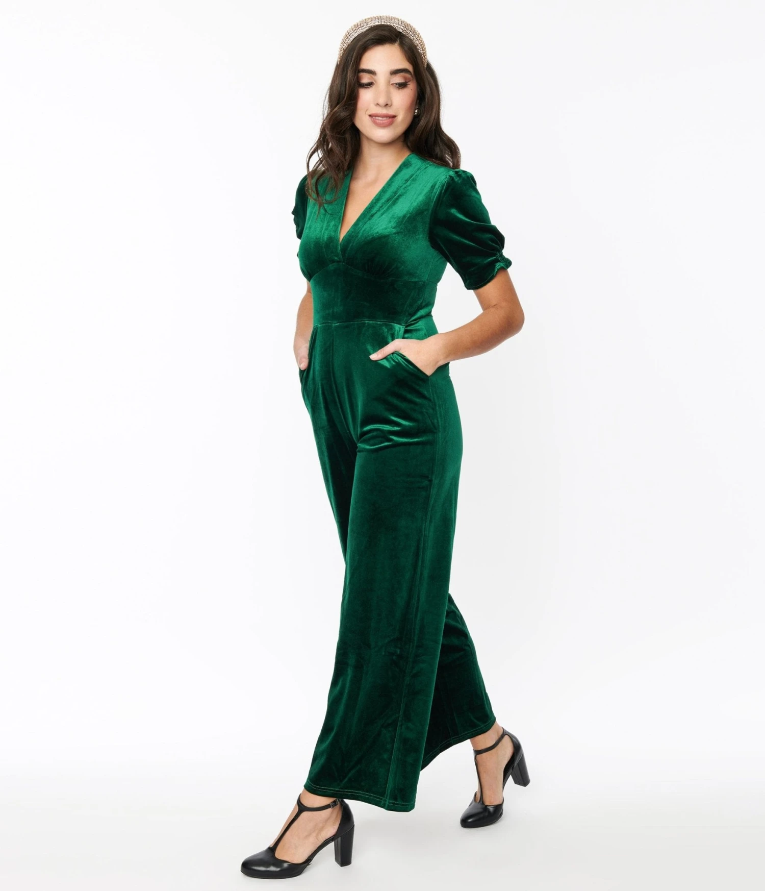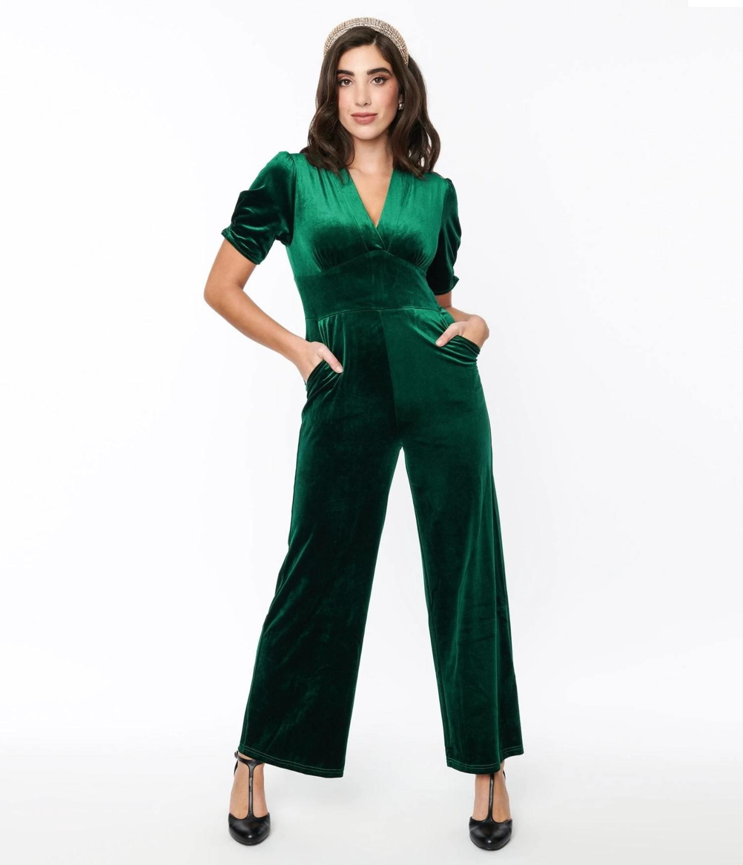 Crafted from a beautiful emerald green velvet, this eye-catching jumpsuit will have heads turning wherever you go. Showcasing short smocked sleeves and a flattering V-neckline, it perfectly combines comfort and style. Plus, you’ll love the convenience of side pockets to keep your essentials close at hand. Effortlessly slip into this head-turning garment with its convenient back zipper closure.