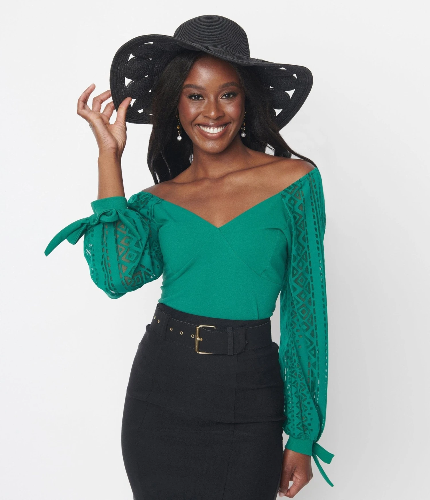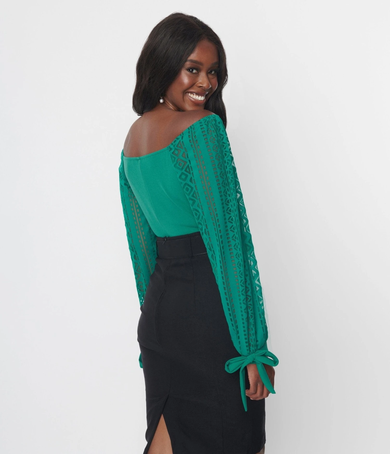 Perfect for those who love a touch of elegance and style, this charming green knit top features a flattering V neckline and elastic shoulders that effortlessly highlights your collarbones. With its long geometric mesh sleeves and self-tie cuffs, you’ll feel confident and chic wherever you go.