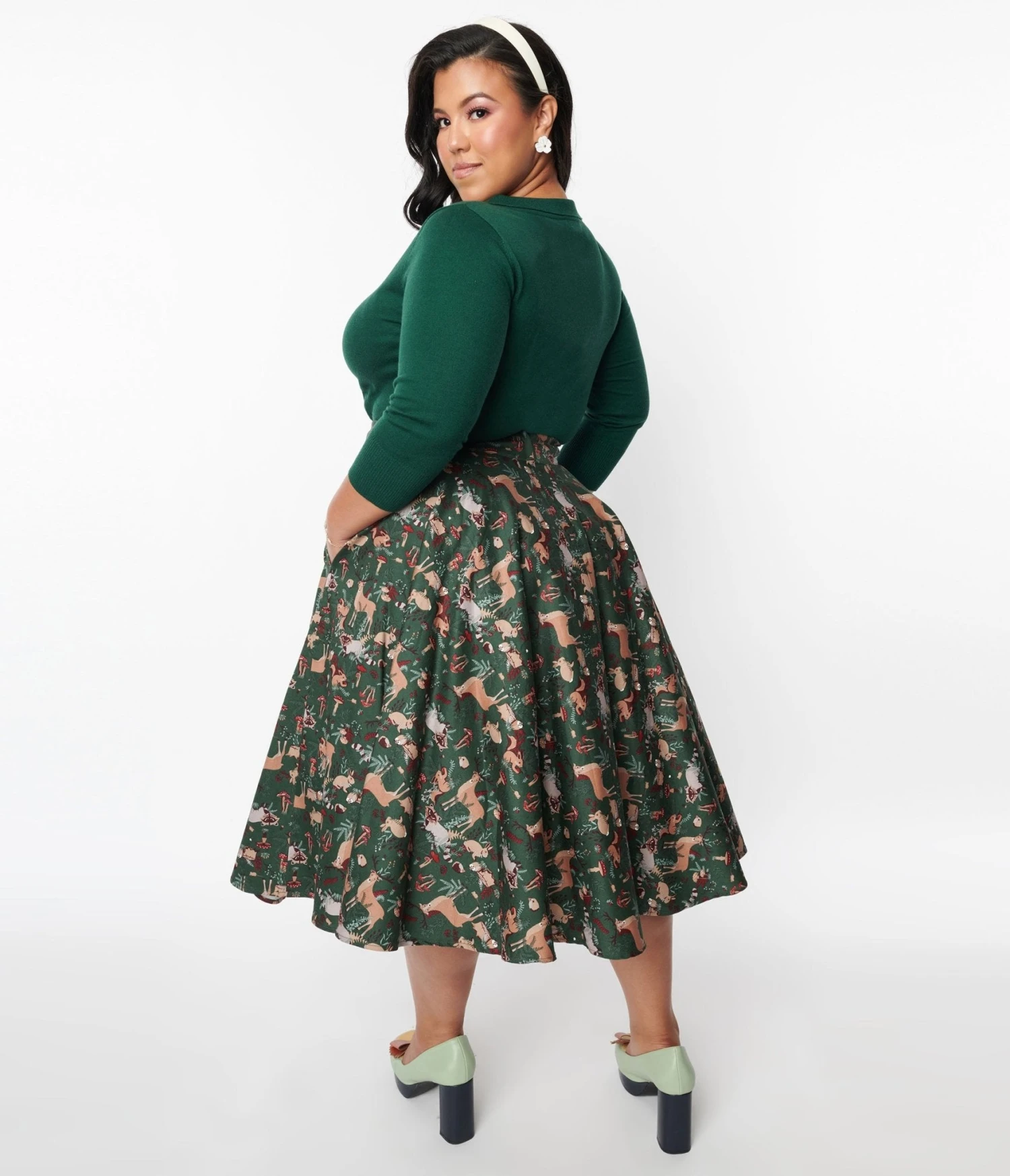 This charming 1950s style skirt features a delightful print of adorable woodland creatures, bringing nature-inspired joy to your wardrobe. With its flattering swing silhouette and vibrant green color, it’s the perfect choice for adding an enchanting touch to your outfits. The convenient back zipper ensures easy on-and-off while the handy side pockets add functionality and flair. Step into a whimsical world where fashion meets friendly forest fauna!
