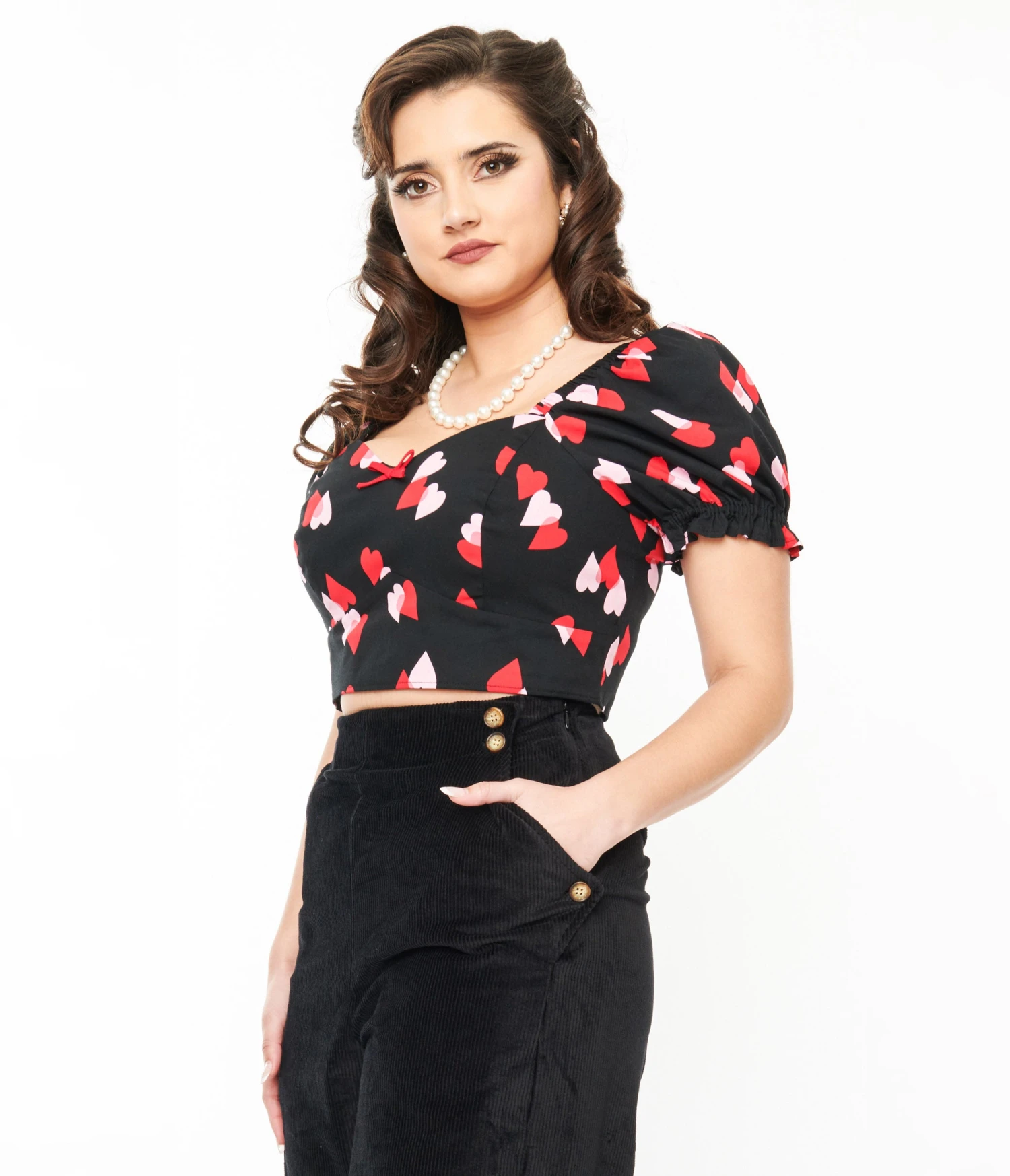 This cute and flirty top from Hell Bunny features a stunning black color adorned with a playful print of red and pink hearts. The sweetheart neckline is accentuated by a charming red faux bow, adding an extra touch of sweetness to your look. The short puff sleeves have elastic ruffle cuffs, giving you that feminine and fun vibe. Plus, getting in and out of this crop top is a breeze thanks to the convenient back zipper.