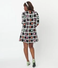 This adorable 1950’s style shift dress from Hell Bunny is crafted on a black and white checkered lightweight woven fabric and dances with colorful daisies throughout. Outfitted with a high scoop neck, long sleeves and secured with a back zipper.