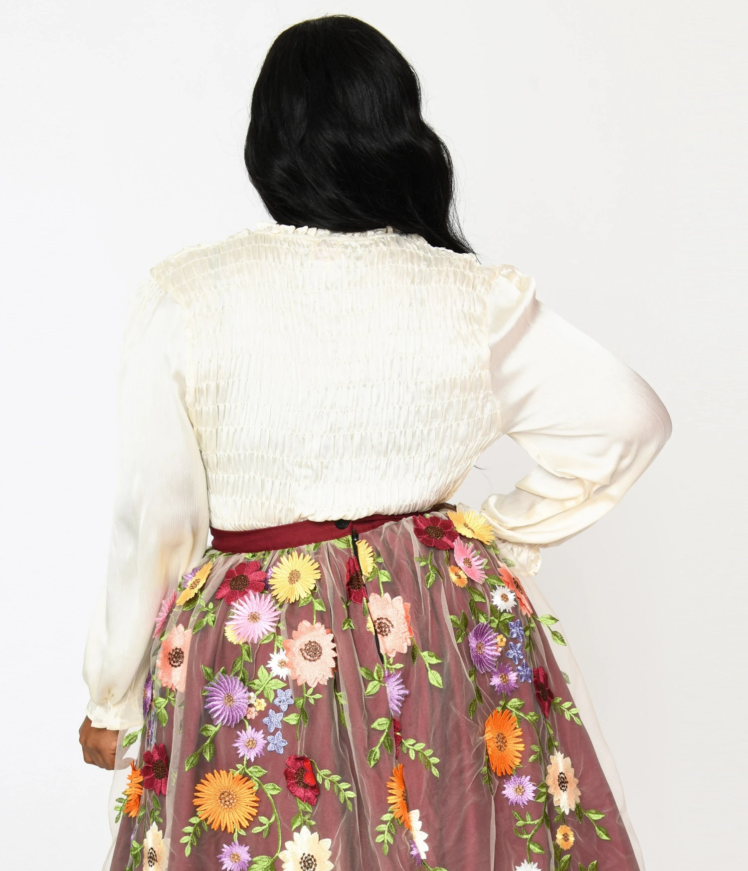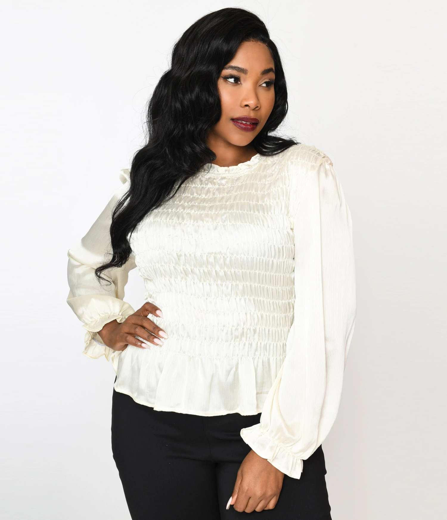 This captivating 1970s style piece is perfect for adding a touch of elegance and flair to any outfit. The soft, ivory-colored satin fabric gracefully drapes over your silhouette, while the smocked bodice ensures a flattering fit that accentuates your curves in all the right places. The scoop neckline adorned with delicate ruffle trim adds a playful touch of femininity, making you feel like an absolute fashion icon. With its stylish long sleeves featuring elastic ruffle cuffs, this blouse effortlessly transitions from day to night, keeping you comfortable and trendy throughout any occasion.