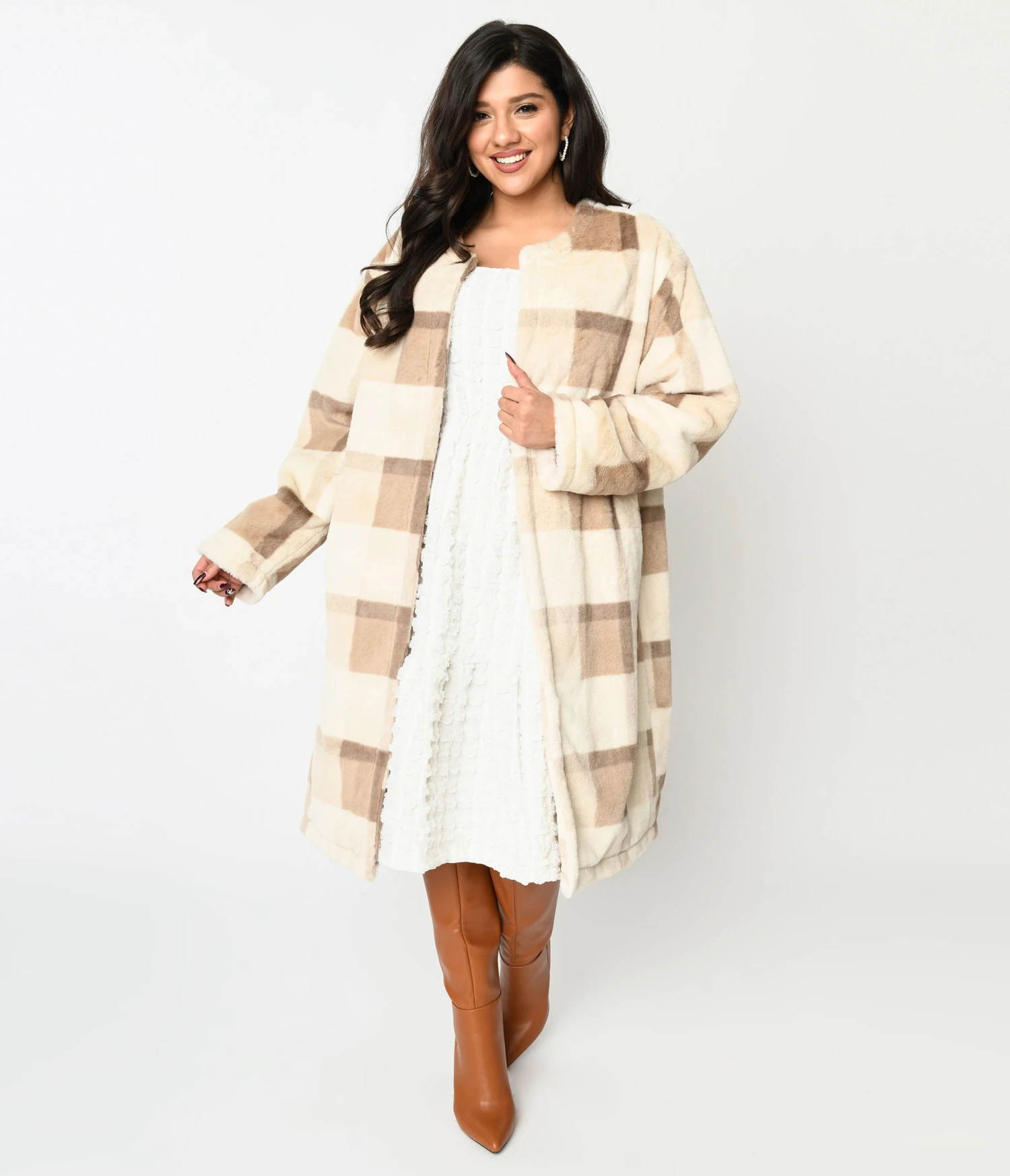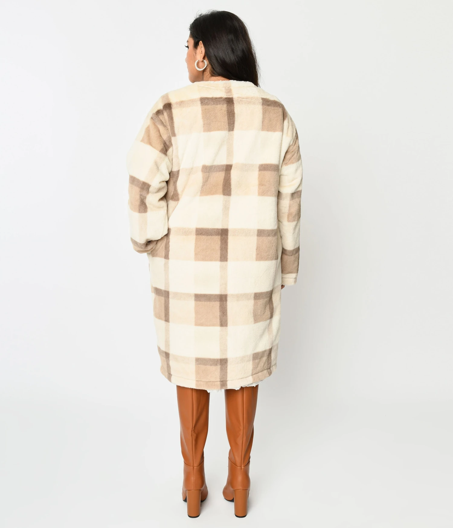 Ivory & Tan Plaid Faux Fur Long Cardigan