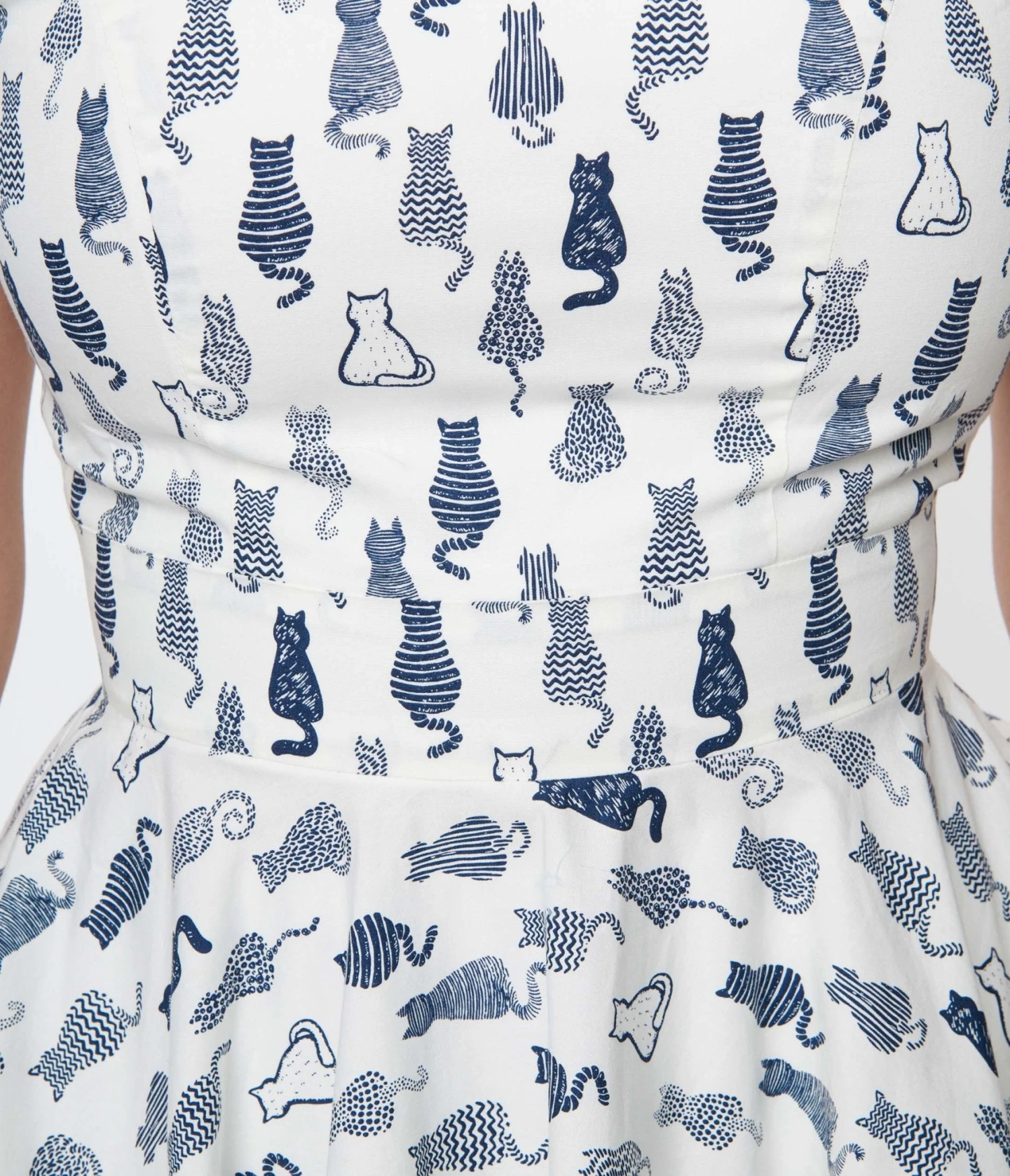 This charming 1950s swing dress is set in a ivory woven dancing with adorable navy cat doodles throughout. Outfitted with a square neckline and short cap sleeves. Complete with a back zipper!