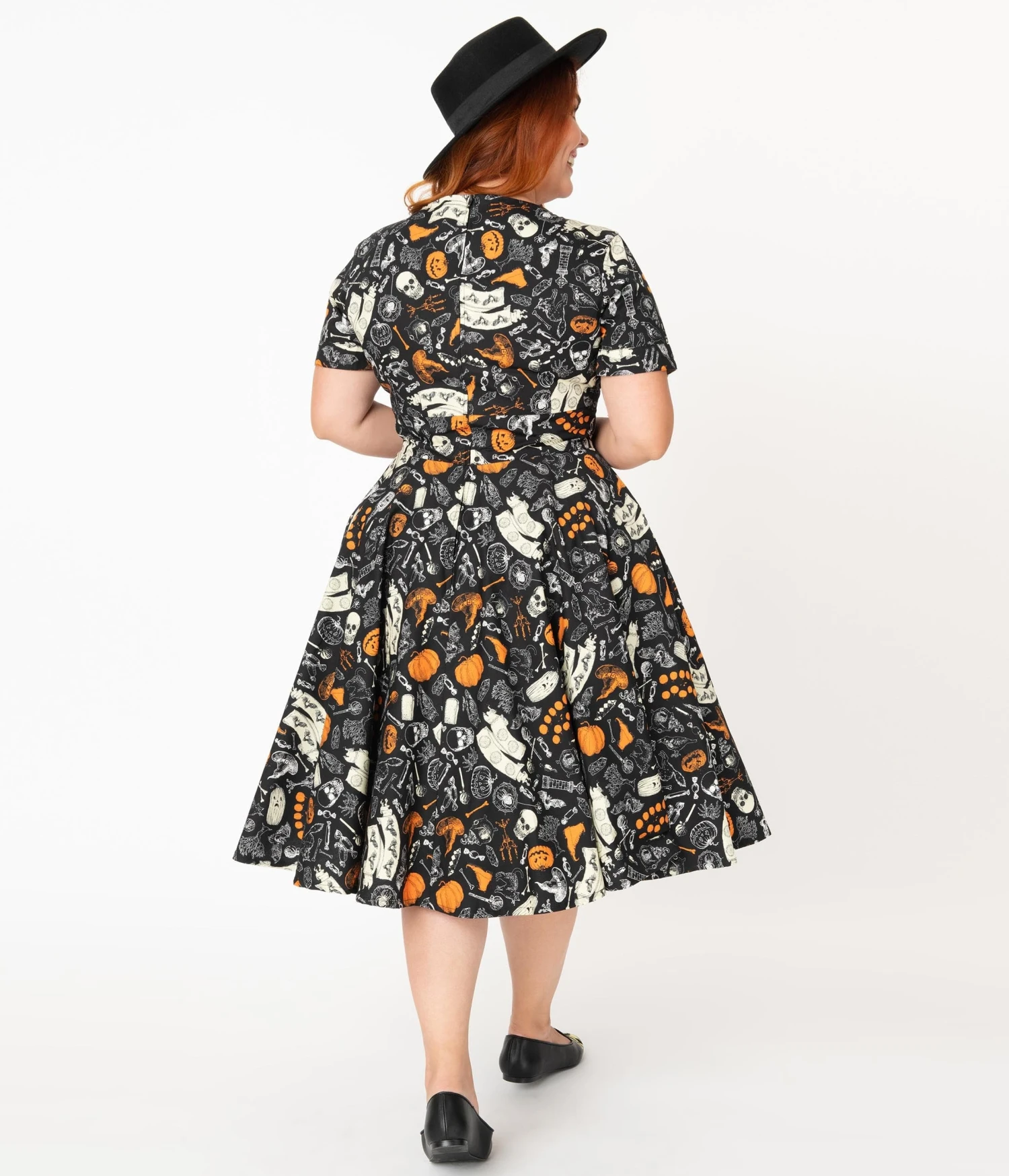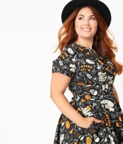 Give your wardrobe a scare, darling! This frightfully delightful plus size swing dress boasts a brilliant print of Halloween iconography, including skulls, pumpkins, and bats, throughout the spooky black backdrop. Crafted in a marvelous cotton, the modest V-neckline is centered by faux buttons for a dash of retro style while the darted bodice is framed by cute short sleeves. The banded waist is cinched with a back zipper while the sweeping swing skirt is outfitted with functional side pockets for a truly spooky look!Â