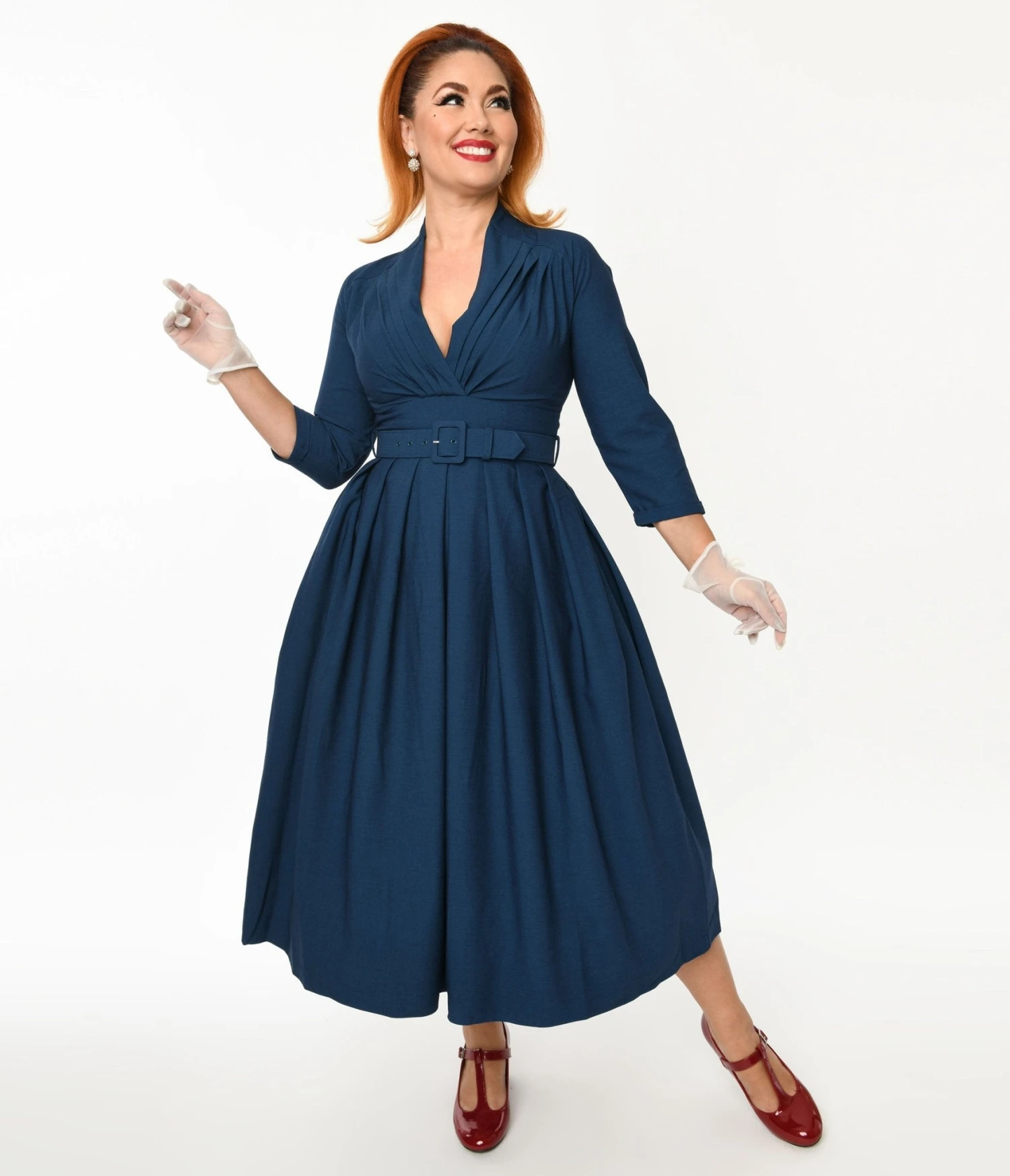 This glamorous 1940s style midi dress is your ticket to a night filled with excitement and compliments. The rich navy blue woven fabric exudes elegance, while the V-neckline and quarter sleeves add a touch of sophistication. Never worry about finding the perfect belt again – this dress comes complete with a matching one that cinches at the waist for a flattering fit. Practicality meets style with convenient side pockets, perfect for storing small essentials or striking a chic pose. The back zipper ensures effortless wear, allowing you more time to dance the night away in pure joy.