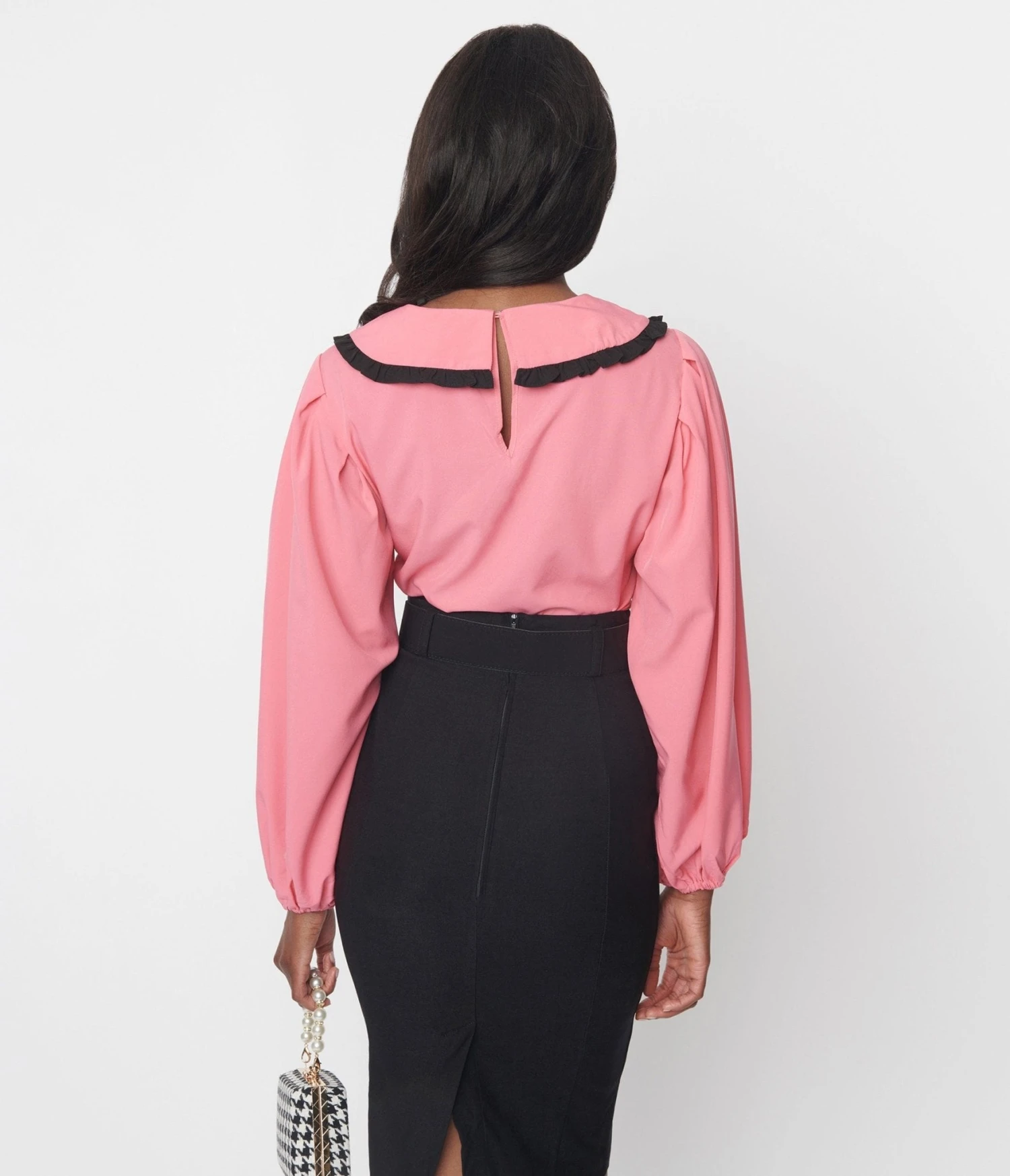 Pink & Black Ruffle Trim Long Sleeve Blouse