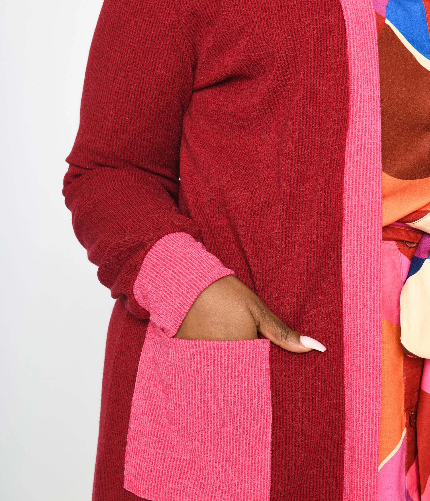 Plus Long Berry & Pink Contrast Open Long Cardigan