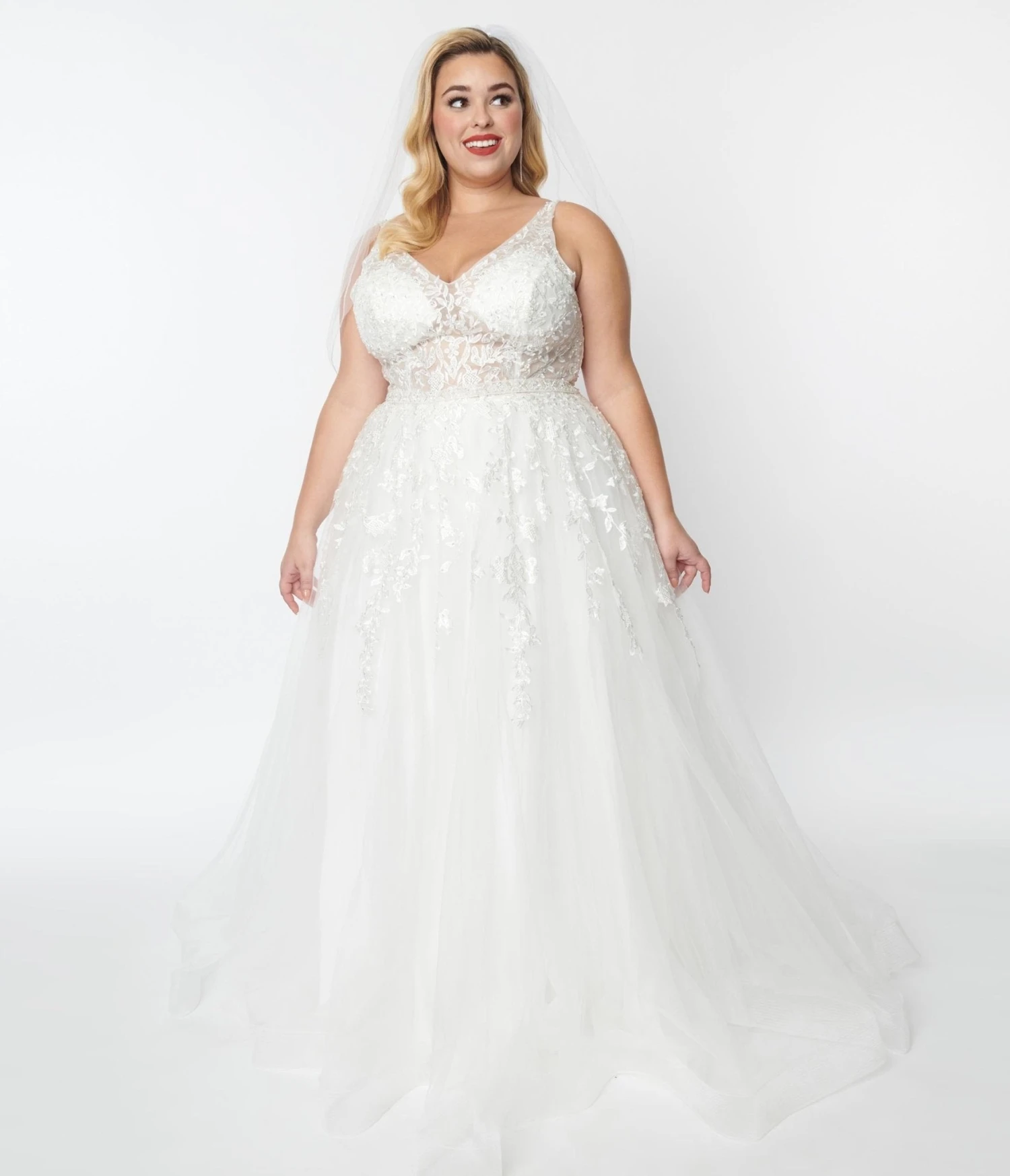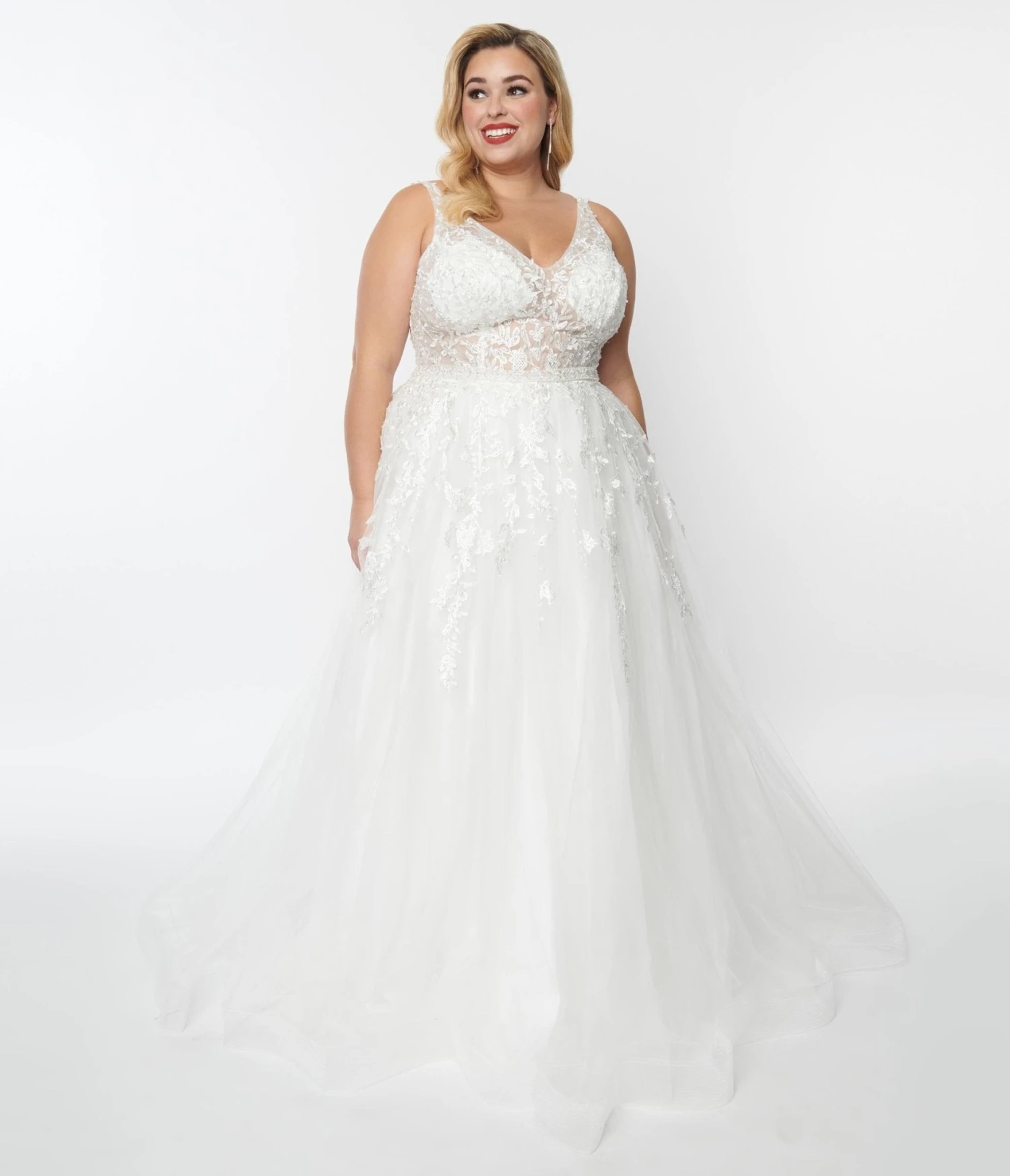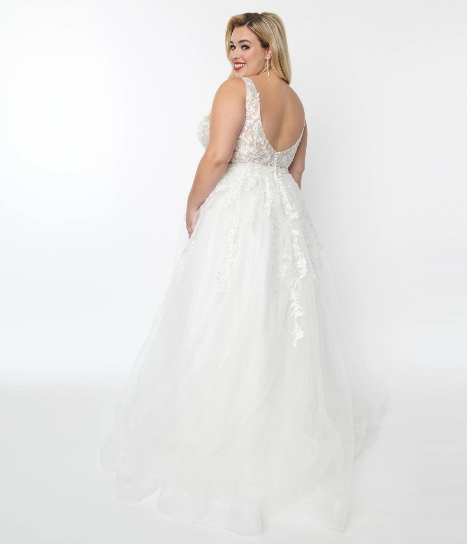 Plus Size Ivory Floral Lace & Tulle Wedding Ball Gown