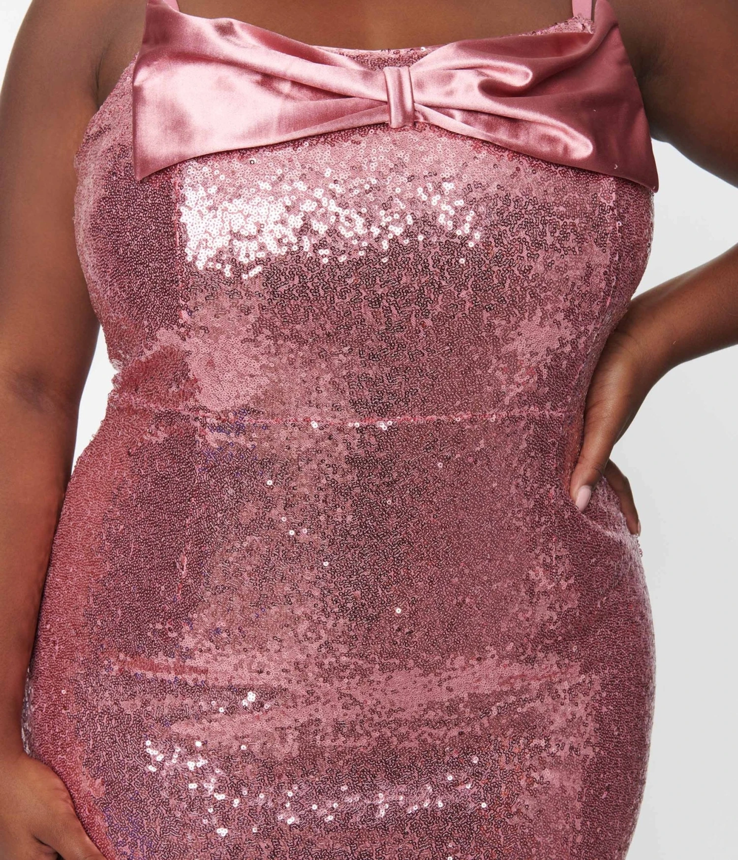 Give Barbie a run for her money with this glamorous plus size wiggle dress. The Malibu Dress is fashioned with pink sequins and a satin bow bust detail. Complete with a back zipper and adjustable spaghetti strap.