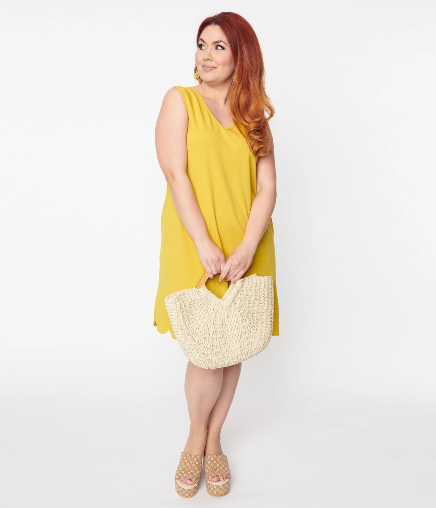 This adorable plus size shift dress is crafted in a lovely yellow knit blend and features scalloped hem. Complete with a V-neckline and side pockets.