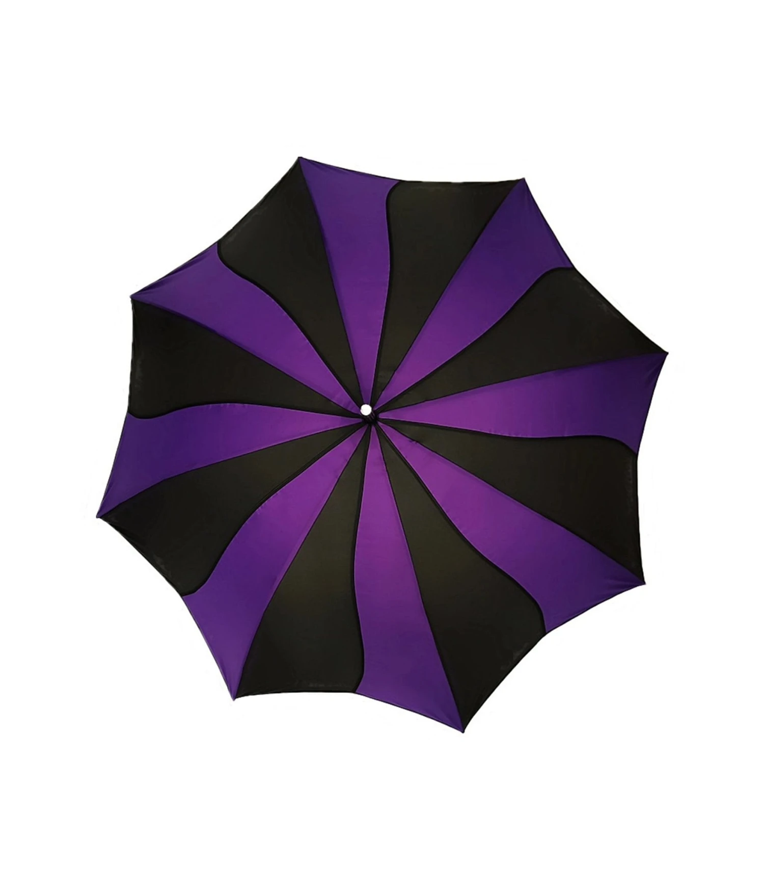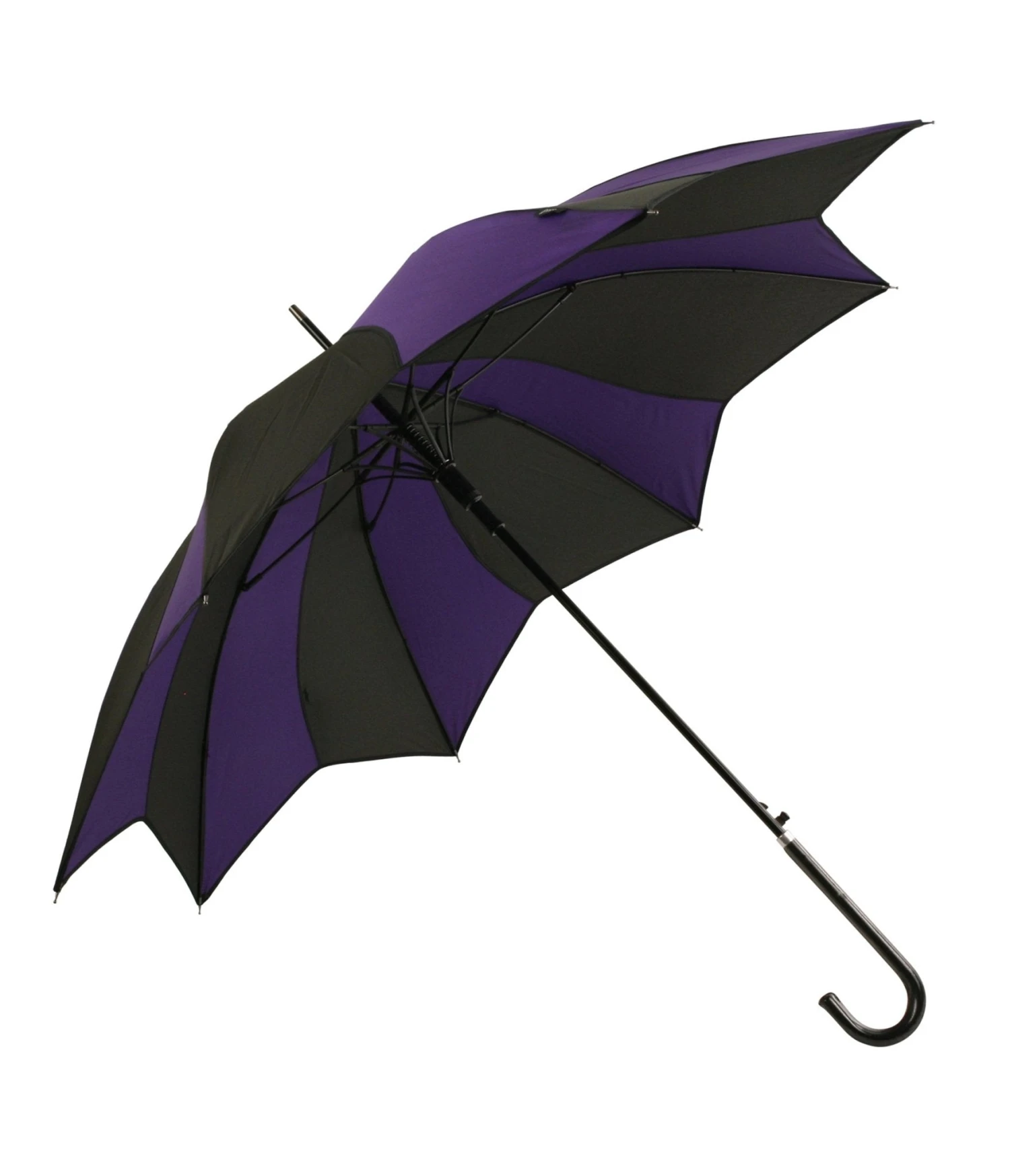 This adorable umbrella is crafted in a black and purple stripe waterproof material. It features 16 steel ribs, a manual opening mechanism, and a fine faux leather effect hooked handle.