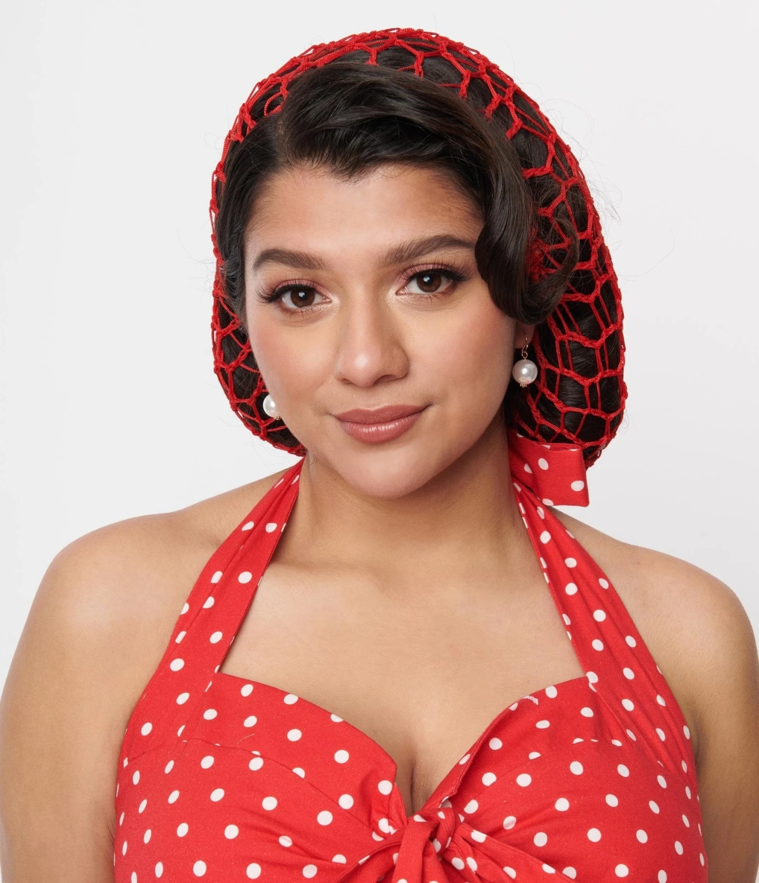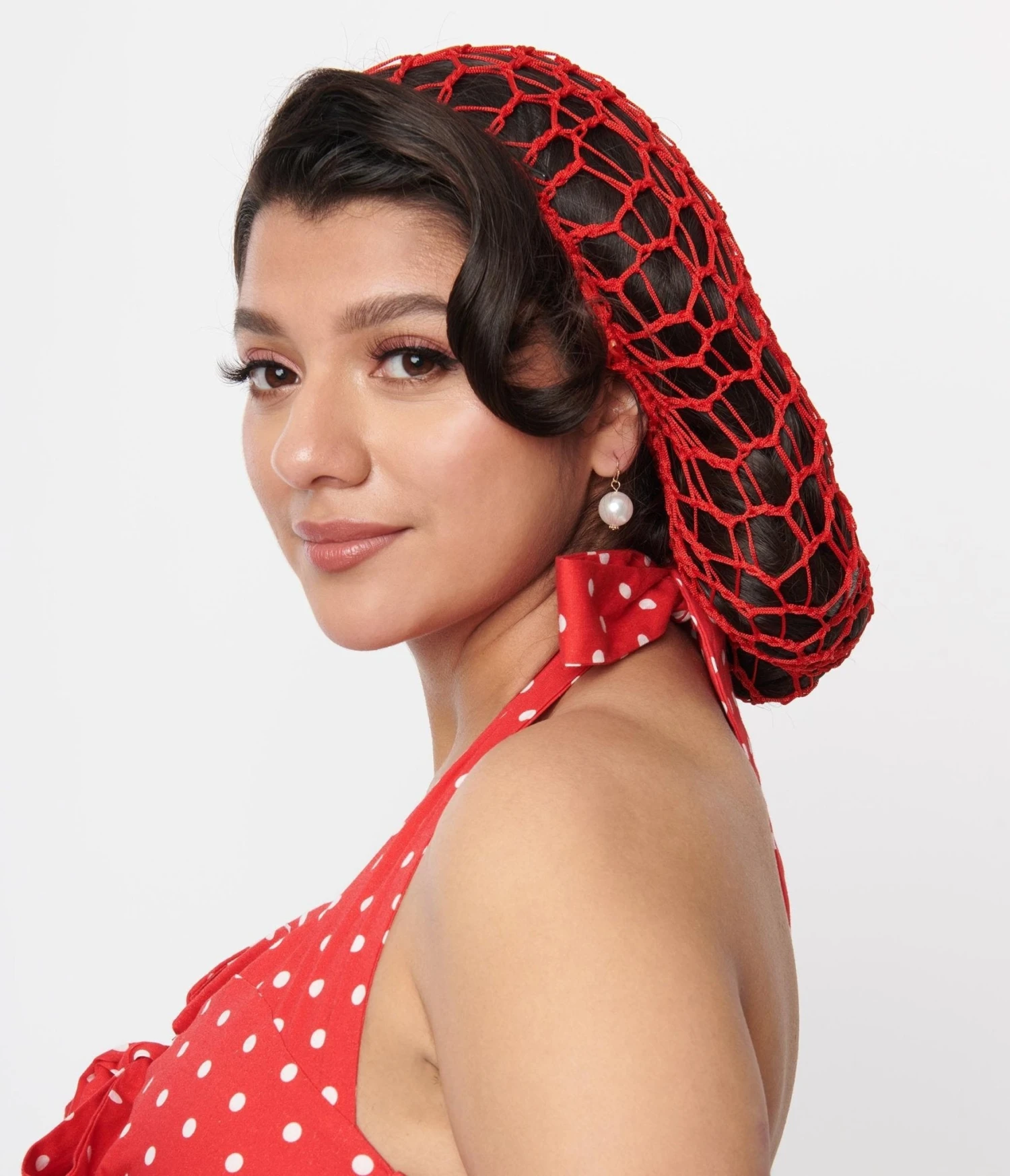 This retro red crochet style snood can be styled in a multitude of ways, with an open knit form and elasticized band for fit!