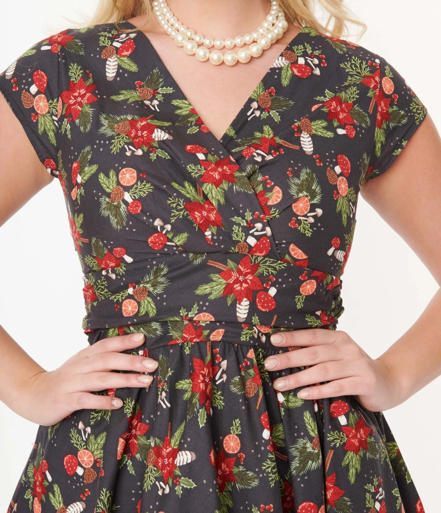 This charming 1950s style swing dress from Retrolicious is set in a brown woven fabric featuring a print of holiday florals throughout. Outfitted with a surplice neckline and pleated waist. Complete with a back zipper and side pockets!
