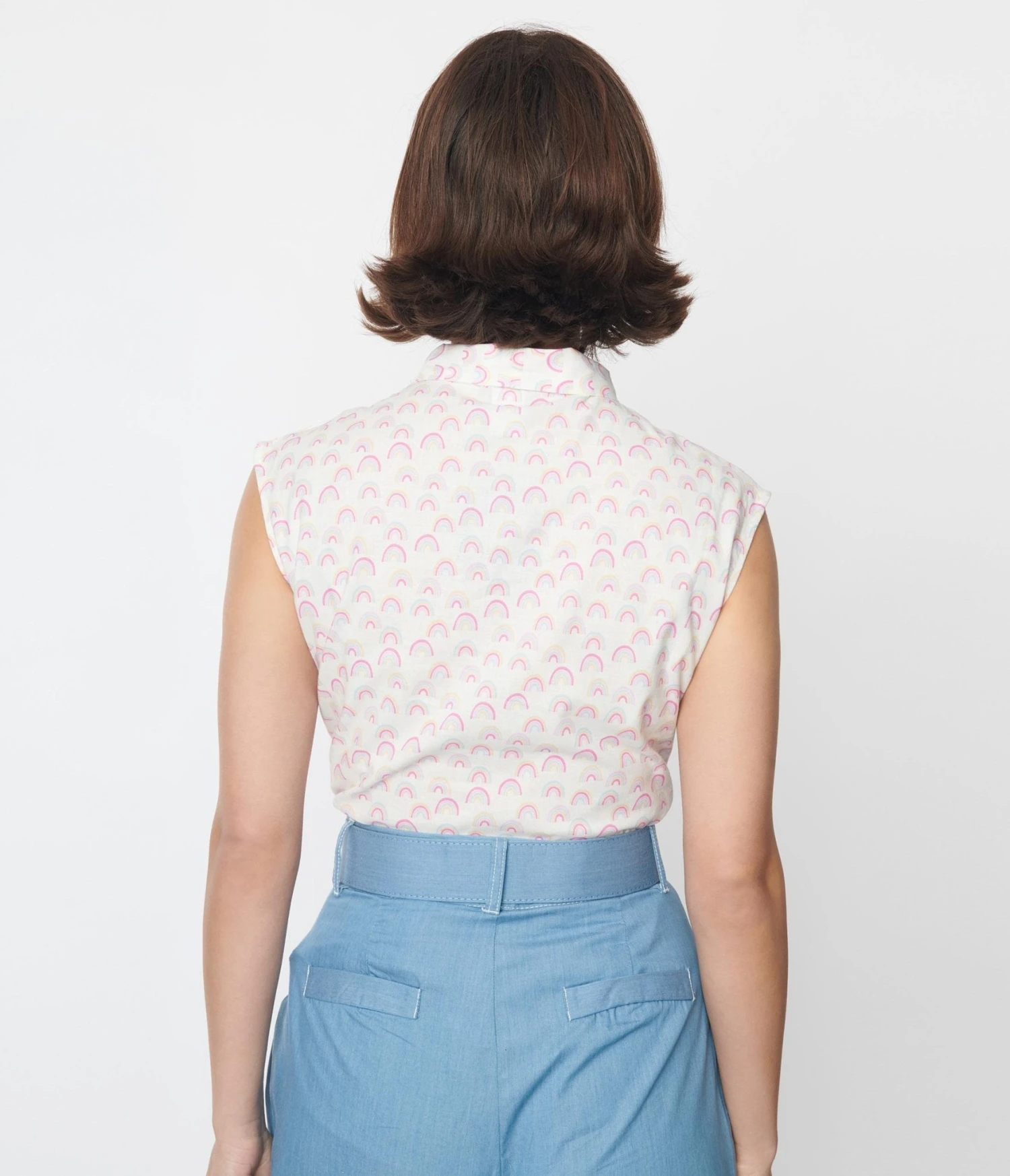This lovely 1950s style top from Retrolicious is crafted in a white cotton and features rainbows throughout. Complete with a charming self-tie bow collar and side zipper.