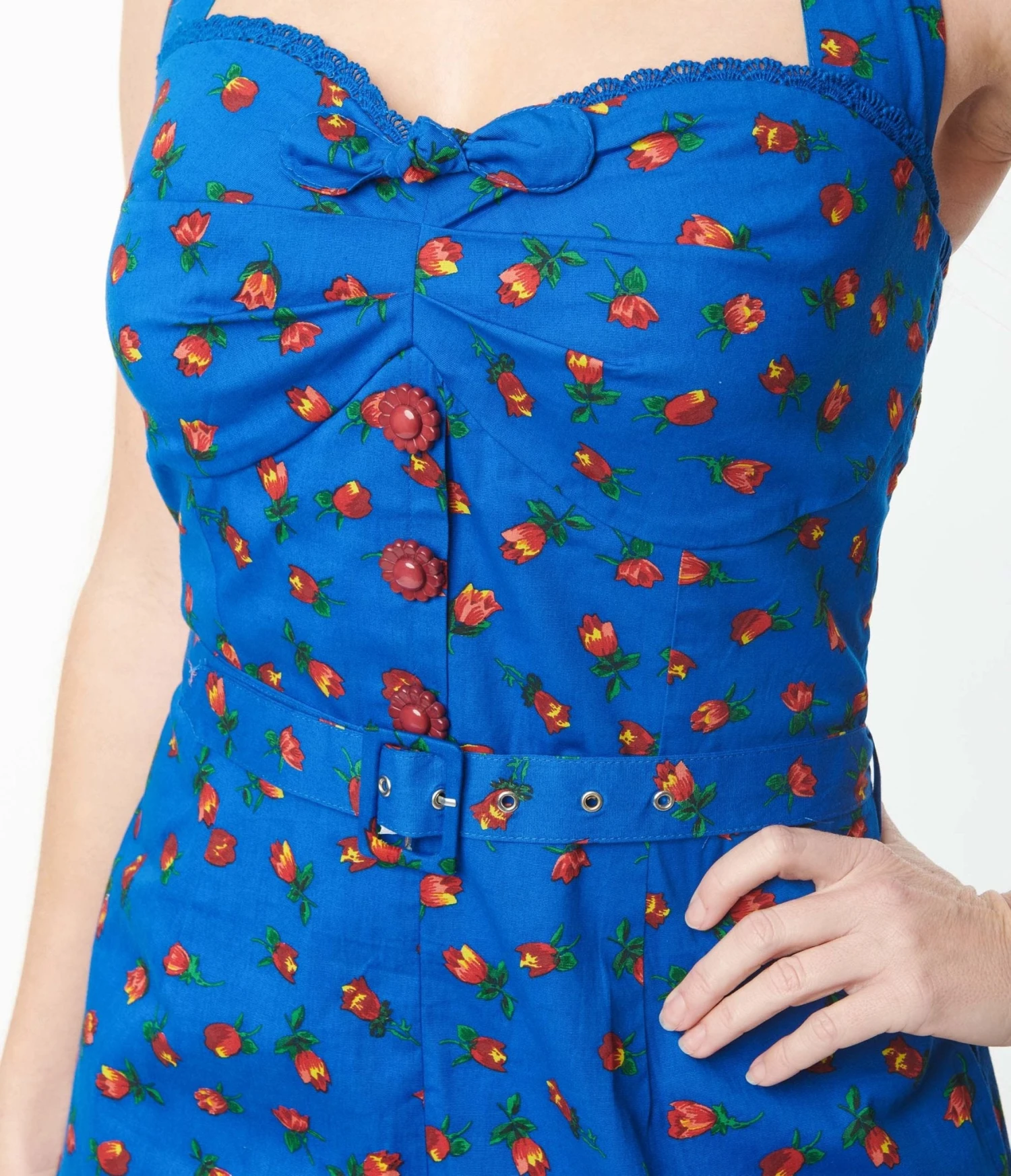 This sweet 1950’s style romper is crafted in a marvelous cotton blend that dazzles in a royal blue and accented with red florals throughout and complete with red floral faux buttons down the front. The sweetheart neckline is embellished with a faux bow and blue lace and is secured with a self tie halter. The waist is cinched with an attached matching belt and a back zipper. The flirtatious shorts are outfitted with side pockets to carry around the admiration!