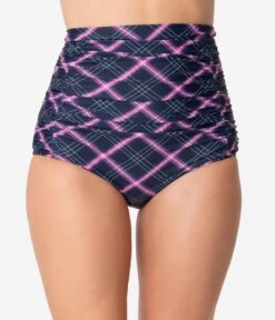 Unique Vintage Navy & Pink Plaid Monroe High Waist Swim Bottom