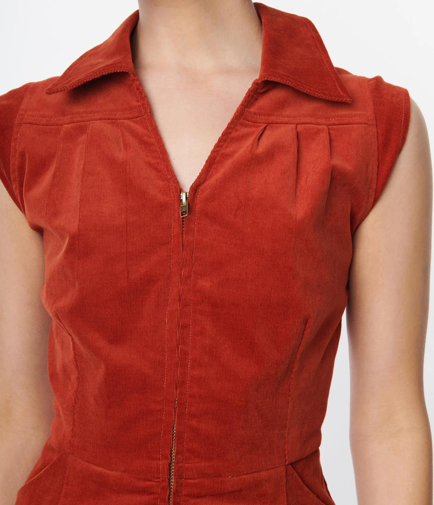 This 1970s style jumpsuit is crafted in a burnt orange woven fabric. Outfitted with a front zipper bodice and collared neckline. Complete with side pockets.