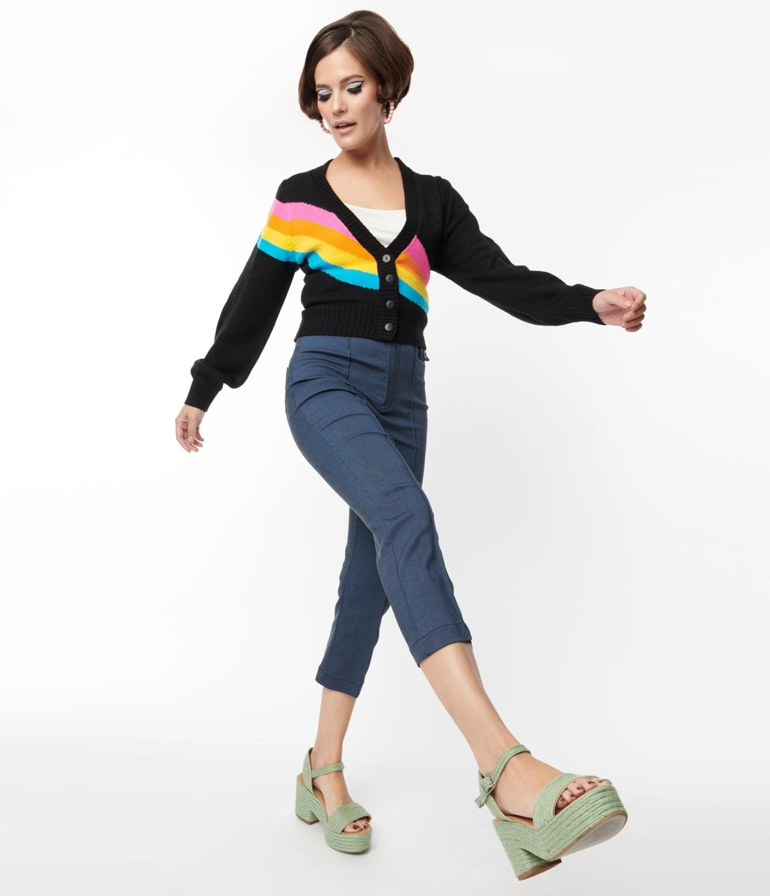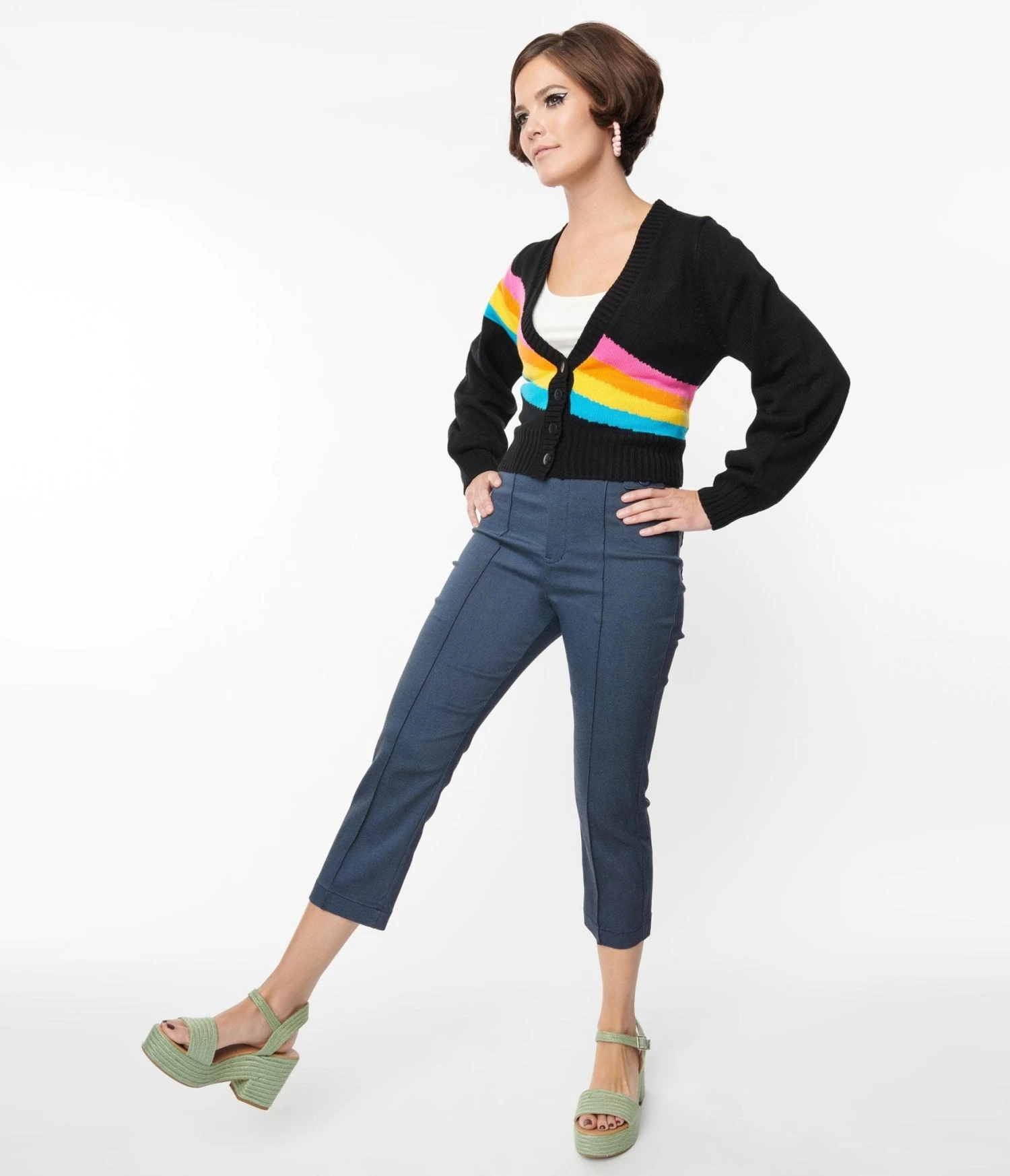 These 1960s style capris are crafted in a fabulous denim colored stretch bengaline fabric, and feature back pockets accented with rainbow embroidery.