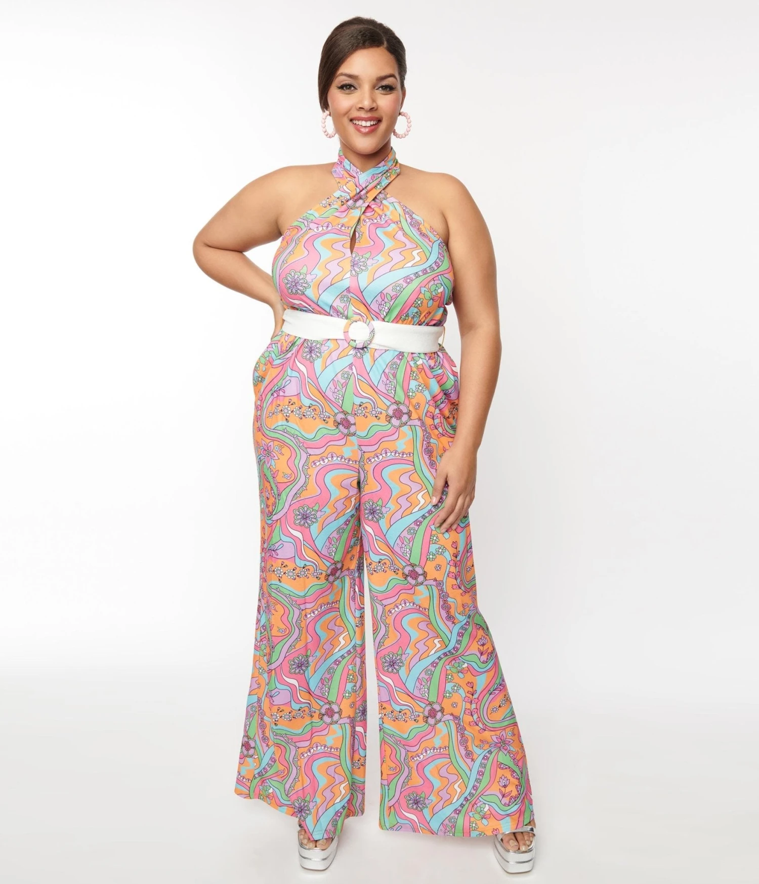 This groovy 1970s inspired jumpsuit is crafted in a knit blend and boasts an eye-catching psychedelic print of daisies and wavy patterns throughout the orange backdrop. Outfitted with a cross halter secured with back buttons, an elastic seamed waist, and belt. Complete with side pockets.