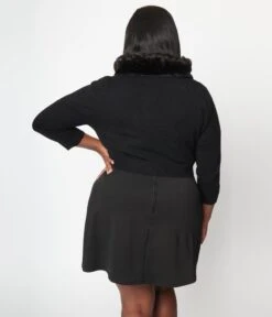 An elegant and cozy plus size cardigan crafted in black knit and outfitted with a faux fur collar. The cropped hem is secured with buttons and is outfitted with long sleeves.