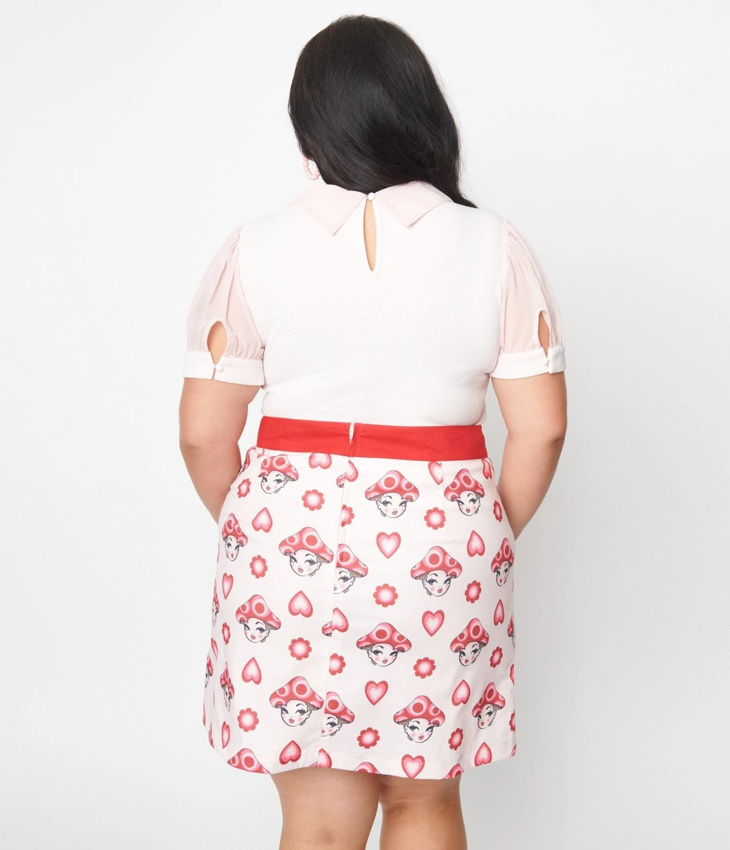 This sweet plus size top is crafted in a light pink knit stretch blend. The classic collar is embroidered with pink hearts and secured with a back button keyhole, while the light pink sheer chiffon puff sleeves frame the silhouette and boast button cuffs.